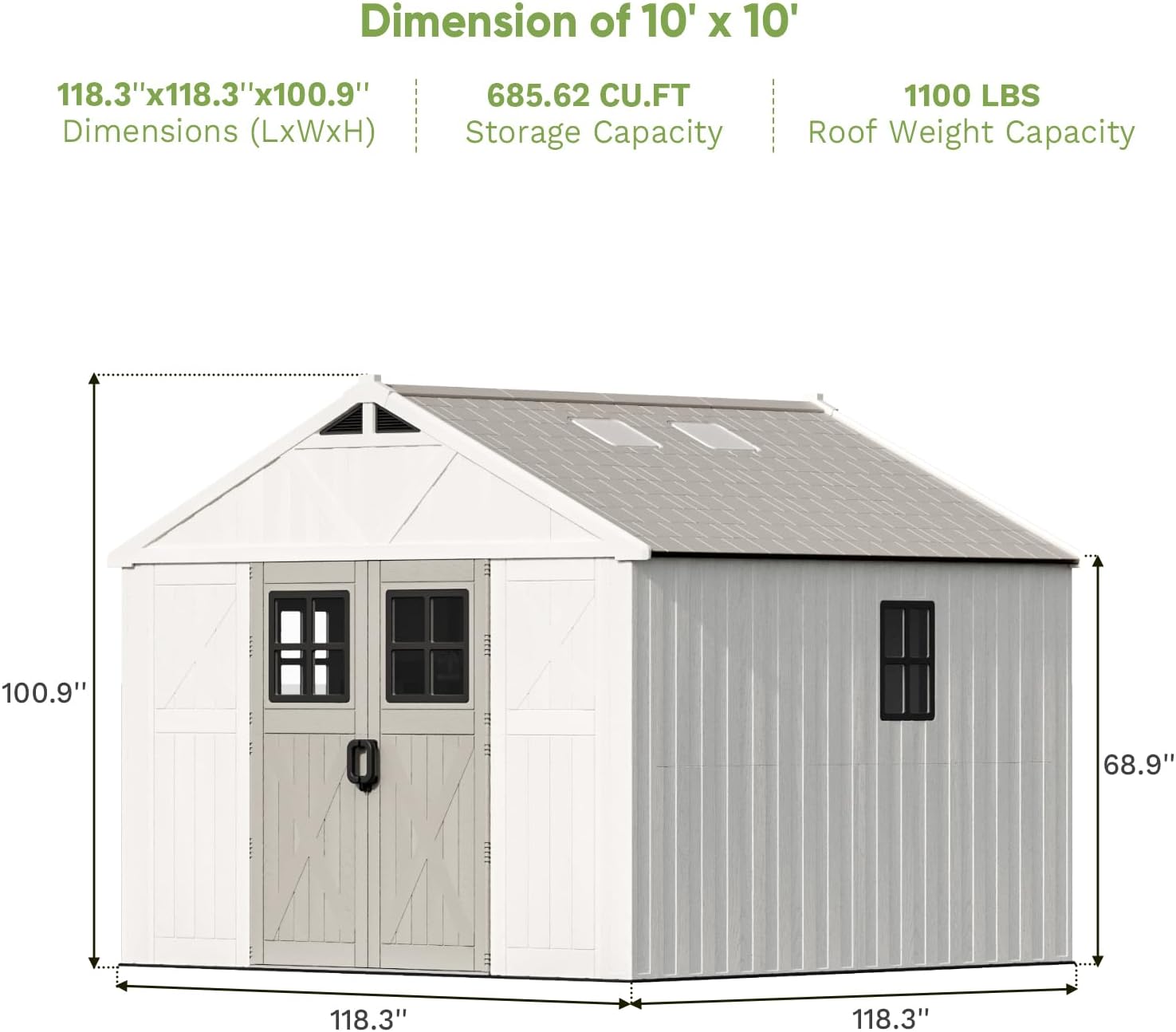 • All-Around Storage Space: The resin shed offers a spacious 10x10 FT area, ideal for storing ladders, gardening tools, bicycles, and more. Its versatile layout can easily transform into a pet house or a large outdoor shed for tools.