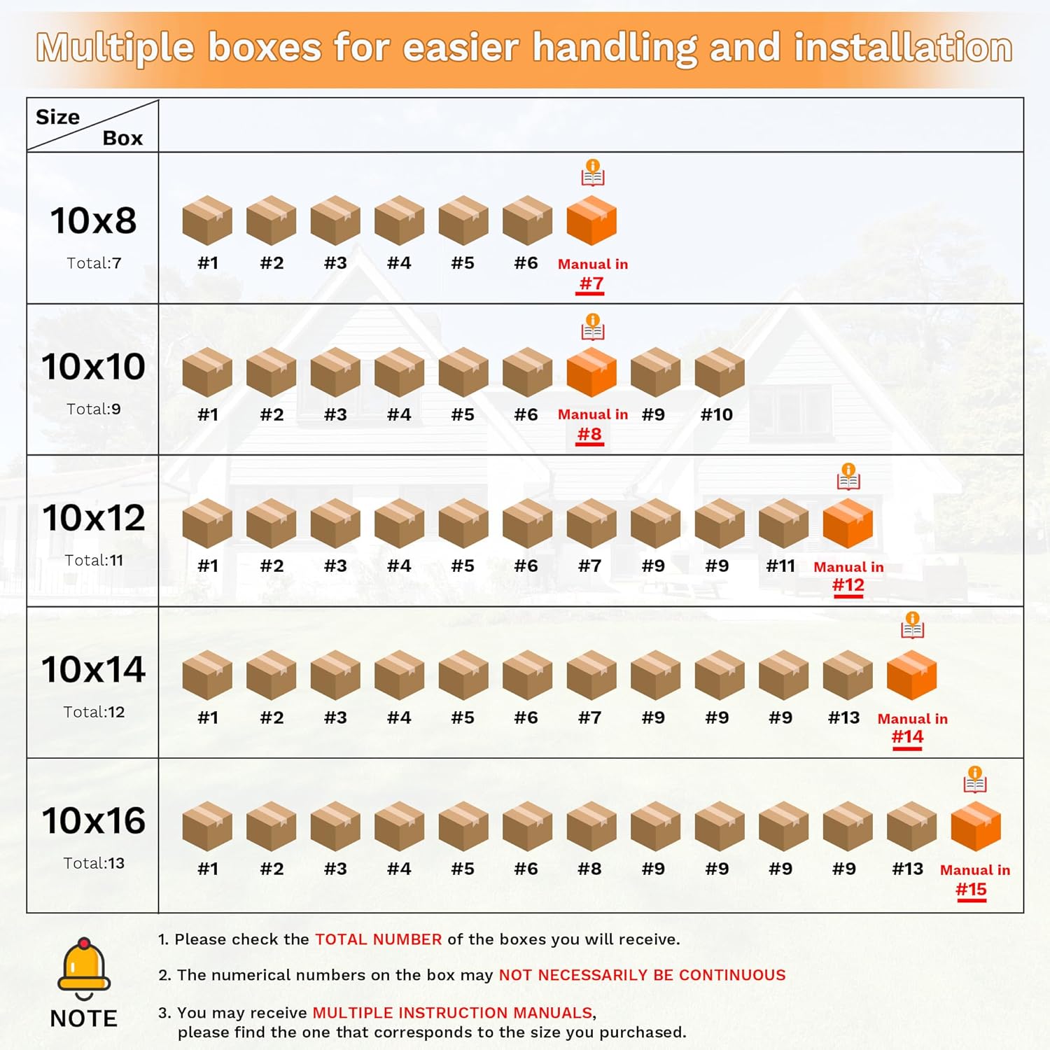 • Note: 1. Please check the policies of your community's homeowners association (HOA) to ensure that this project complies with relevant regulations. 2. The storage shed will be divided into 9 packages, numbered 1, 2, 3, 4, 5, 6, 8, 9, and 10, excluding package 7, which may be delivered in batches. You can scan the QR code on the package or contact us for information about other packages.