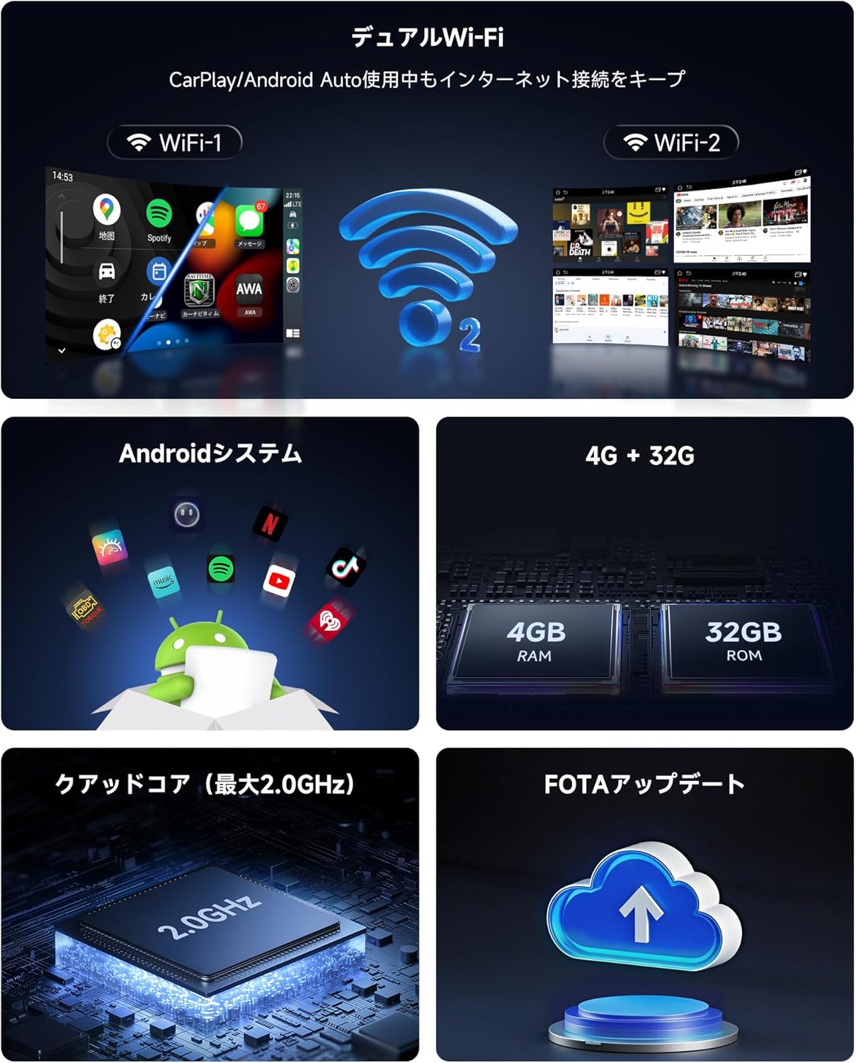 - Dual WiFi & OTA Updates: Maintain a stable internet connection while using CarPlay or Android Auto simultaneously, ensuring uninterrupted entertainment, navigation, and calls. Supports over-the-air (OTA) firmware updates to keep your apps up-to-date