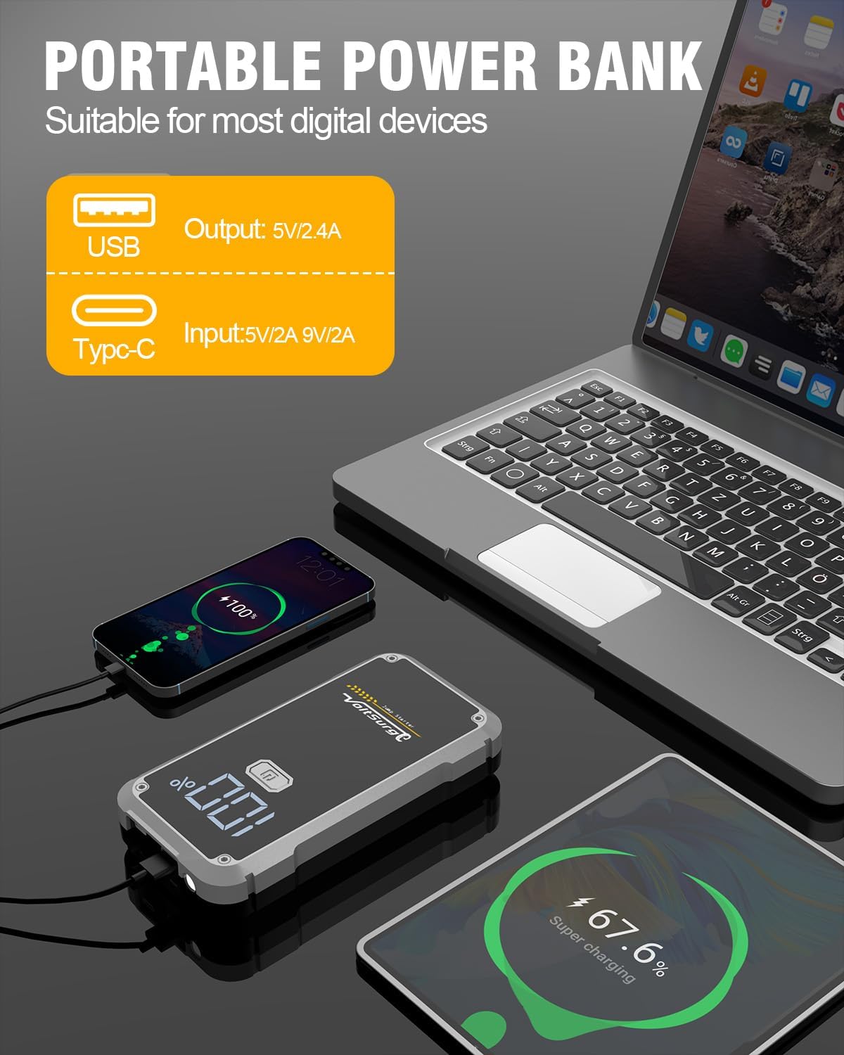 - HUMANIZED DESIGN & LCD DISPLAY - The VoltSurge Battery Jumper Box is equipped with a digital LCD screen to display the battery status. Compared with other devices that don't have an LCD screen but only an indicator, you can check the battery status and remaining charge more intuitively