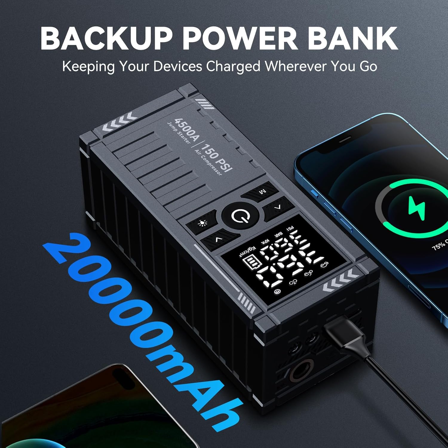 Car Battery Jump Starter with Air Compressor - 4500A 150PSI Portable Car Jump Starters (All Gas/9L Diesel) with Tire Inflator, 12V Car Battery Jump Box with Jumper Cables, LCD Display, LED Light