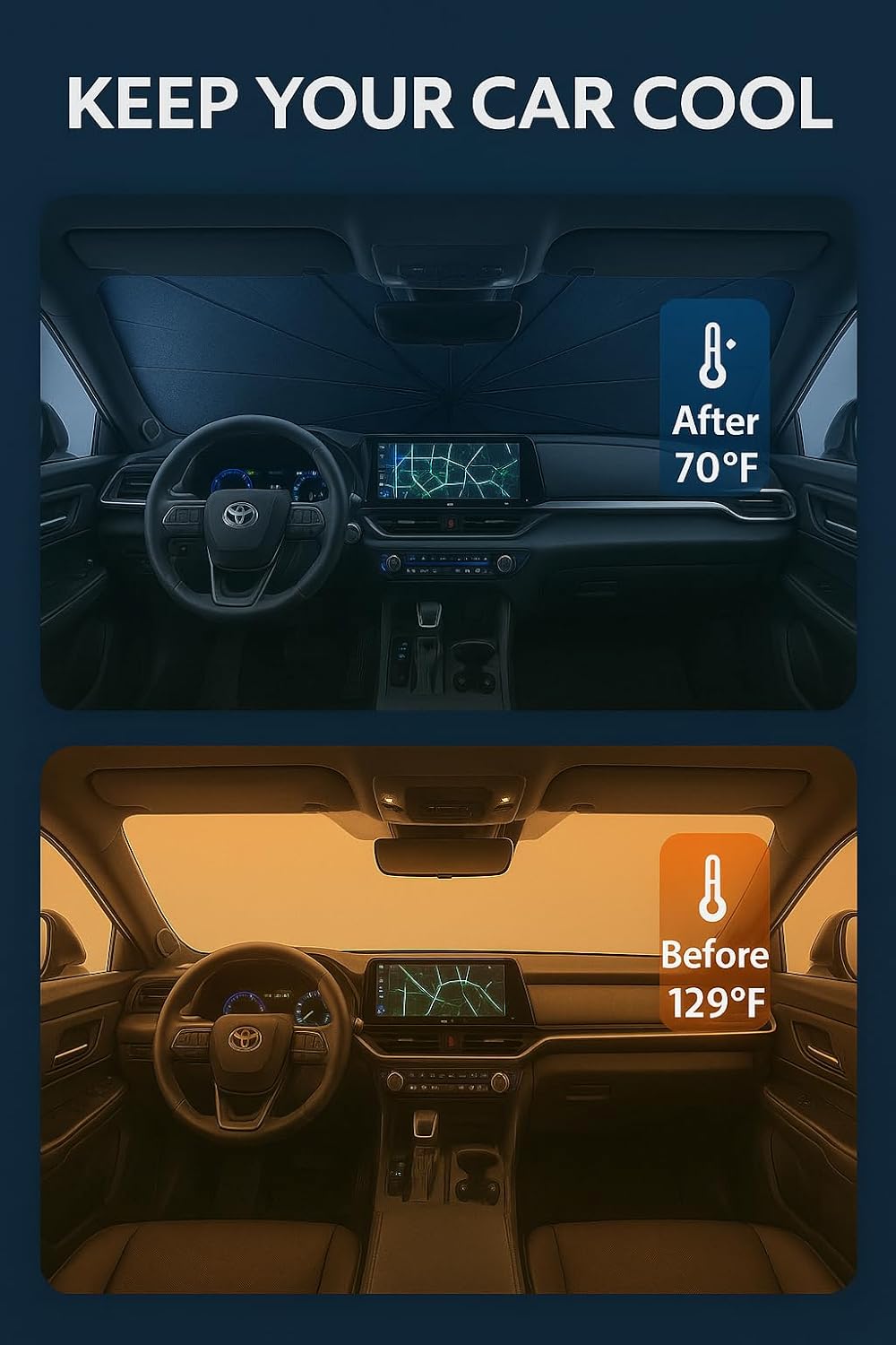 - Innovative Ice Crystal Material: The sunshade adopts a 4-layer design, which is thick enough to effectively block and reflect sunlight. After multiple uses, it is still strong and not easy to tear. The sunshade also uses innovative ice crystal materials to evenly distribute heat, quickly cool down, and keep your car cool all the time. You no longer have to worry about getting your seat or car handle scalded by high temperatures.