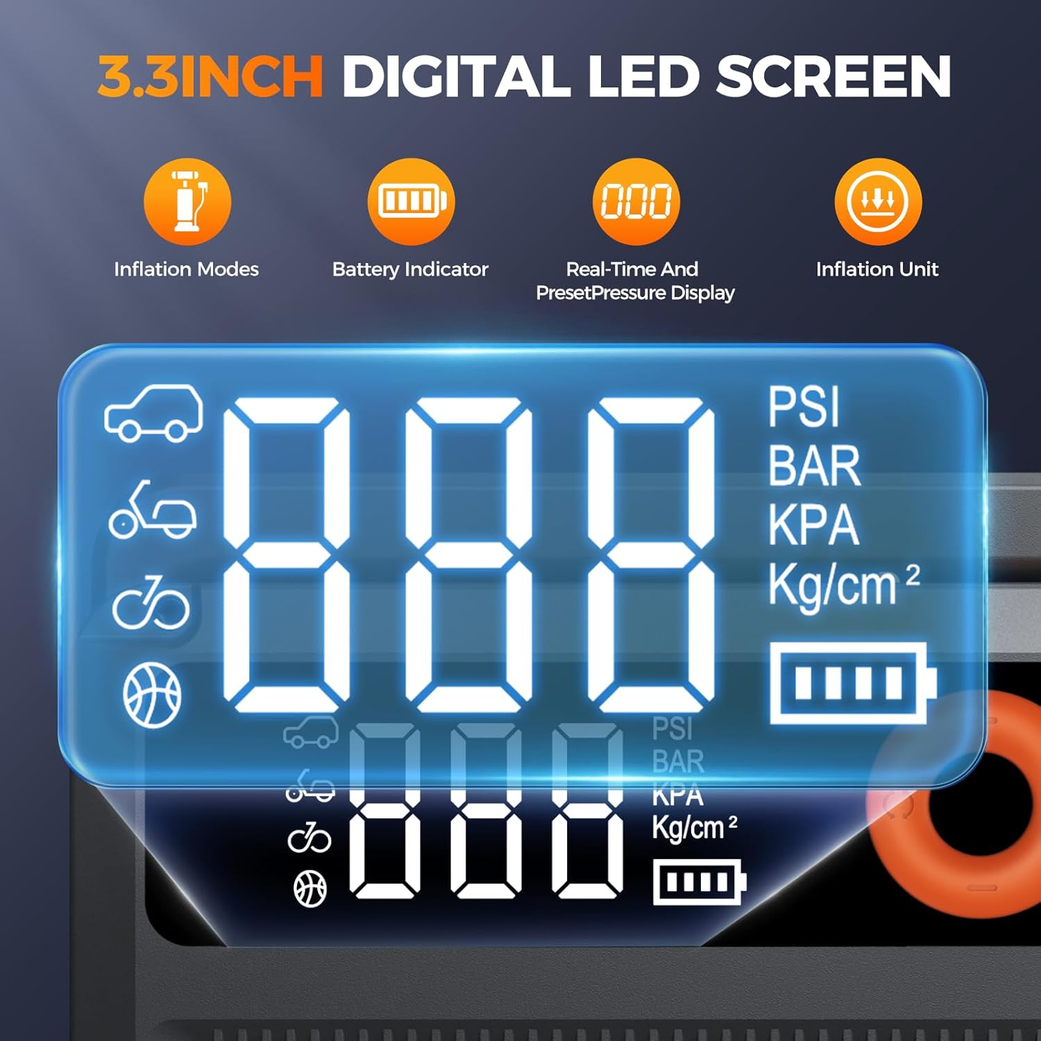 - 【150 PSI Air Compressor & 3.3'' LCD Display】The VX5 portable jump starter with air compressor fill a flat car tire to 30 PSI in just 2 mins—faster than most jump starter! Includes 3 nozzles, 4 selectable units (PSI, BAR, kPa, kg/cm²), 4+N inflation modes, and a 45cm air hose for cars, motorcycles, bikes, balls, etc. The 3.3-inch sunlight-readable LCD display real-time pressure, while 150 PSI presets, integrated sensors, and auto-shutoff ensure accurate inflation and prevent over-inflation!