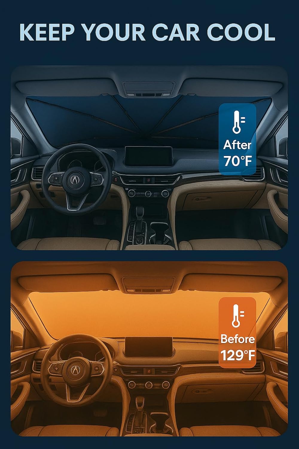 - Innovative Ice Crystal Material: The sunshade adopts a 4-layer design, which is thick enough to effectively block and reflect sunlight. After multiple uses, it is still strong and not easy to tear. The sunshade also uses innovative ice crystal materials to evenly distribute heat, quickly cool down, and keep your car cool all the time. You no longer have to worry about getting your seat or car handle scalded by high temperatures.