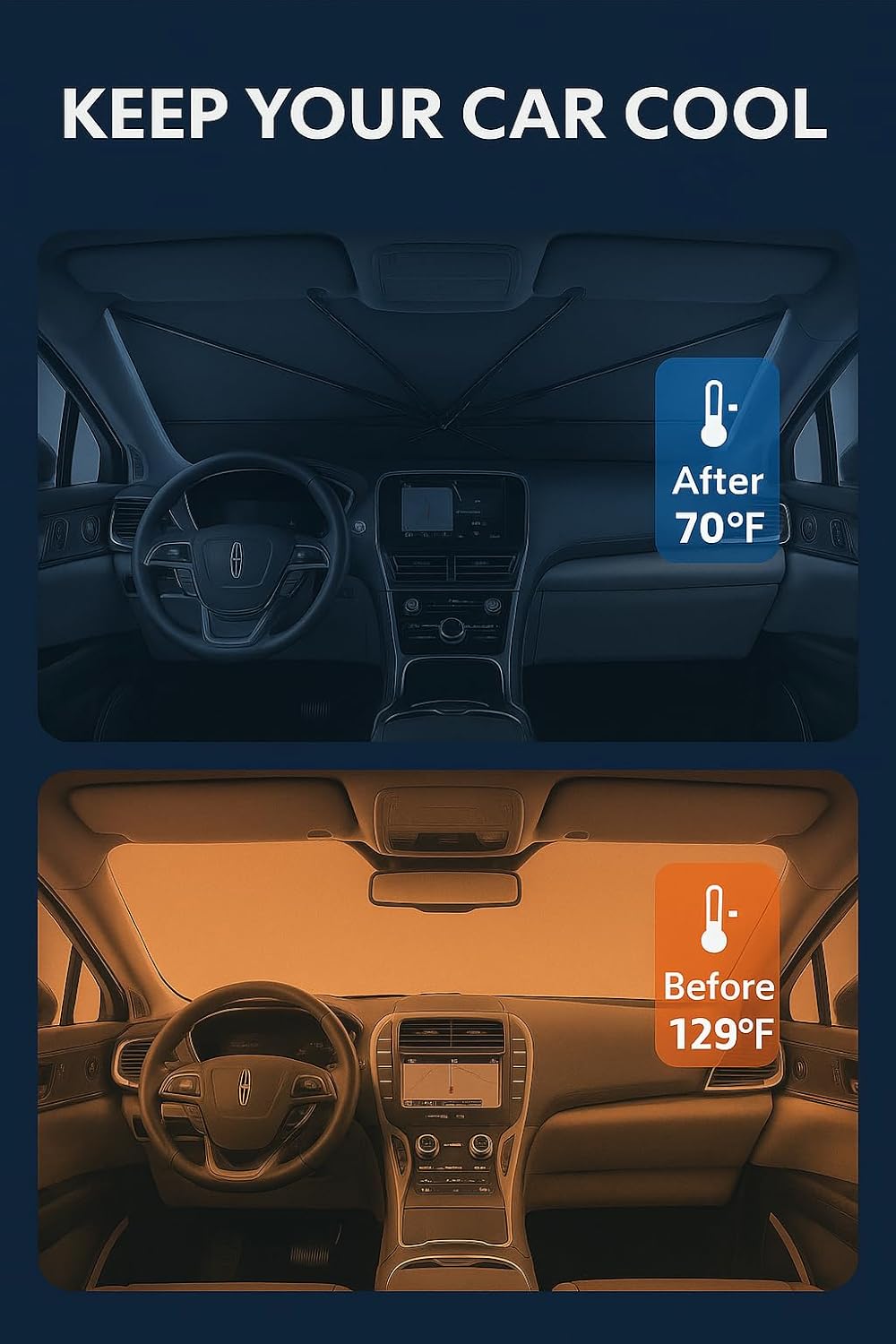 - Innovative Ice Crystal Material: The sunshade adopts a 4-layer design, which is thick enough to effectively block and reflect sunlight. After multiple uses, it is still strong and not easy to tear. The sunshade also uses innovative ice crystal materials to evenly distribute heat, quickly cool down, and keep your car cool all the time. You no longer have to worry about getting your seat or car handle scalded by high temperatures.