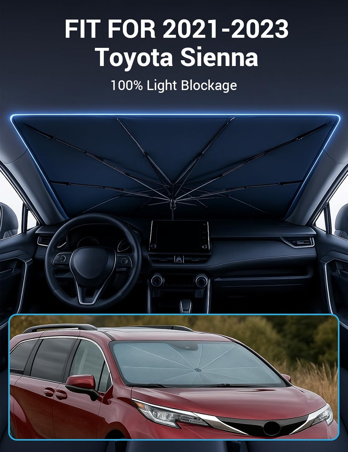 - Certified Sustainable. Customized Windshield Sunshade: Specially designed for the 2021-2025 Toyota Sienna with precise mirror cutouts, providing 100% shading, carbon fiber handle, ensuring lightweight and durability while also having a fashionable feel. Our Sienna windshield sunshade can protect the interior of your car from various light damage and prevent dashboard and seat degradation.