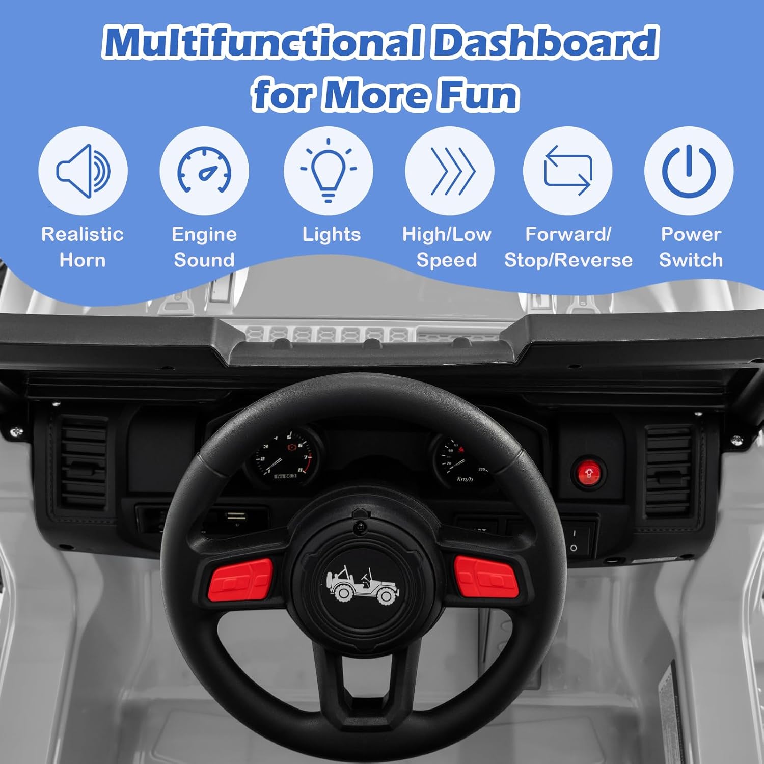 - REALISTIC DRIVING EXPERIENCE: Your kids can simply accelerate, decelerate or brake by operating the realistic non-slip foot pedal. Designed for small hands, the steering wheel has rounded edges and a comfortable grip, complete with horn and engine sound buttons. And the windshield and rearview mirror also greatly increase the sense of reality. The stylish body of the ride on car is made of safe and high quality material, which is firm and durable. No child will refuse this perfect gift.