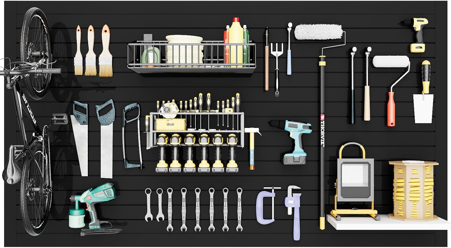 - Ladder & Bike Rack Storage Solution: The system includes eight 4ft x 1ft slat wall panels, covering 32 square feet. You can mix and match these panels to customize your setup. For additional storage, you can expand by adding more panels to accommodate your evolving storage needs, giving you the flexibility to craft the perfect configuration.