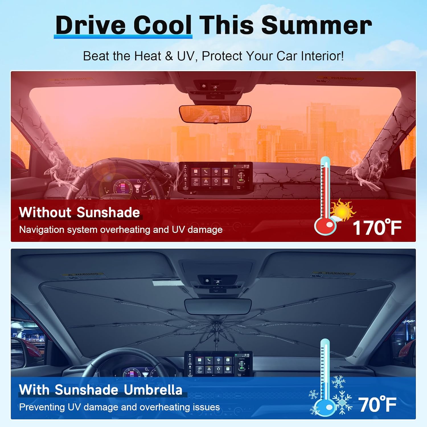 - 3. Enhanced Durability and Stability: Our 2024 2025 Defender Windshield Umbrella uses 10 glass fiber ribs for high strength, heat resistance, and anti-rust performance. Silicone strips withstand 200°C, ensuring durable shade and interior protection