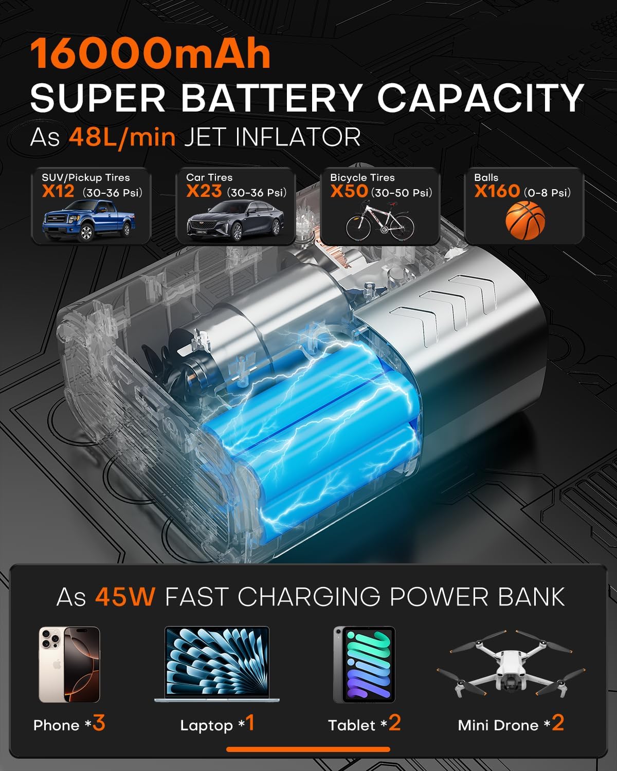 - ⚡【45W Super Fast Charging】As a mobile power supply, equipped with 45W USB-C input and output port and 45W USB-A output port, which can quickly charge the other electronic devices; the power supply speed is 3 times faster than 99% of the air pumps on the market and 2 times faster than most mobile power supplies. car tire pump supports a maximum charging input of 45W and can be fully charged in 2 hours.
