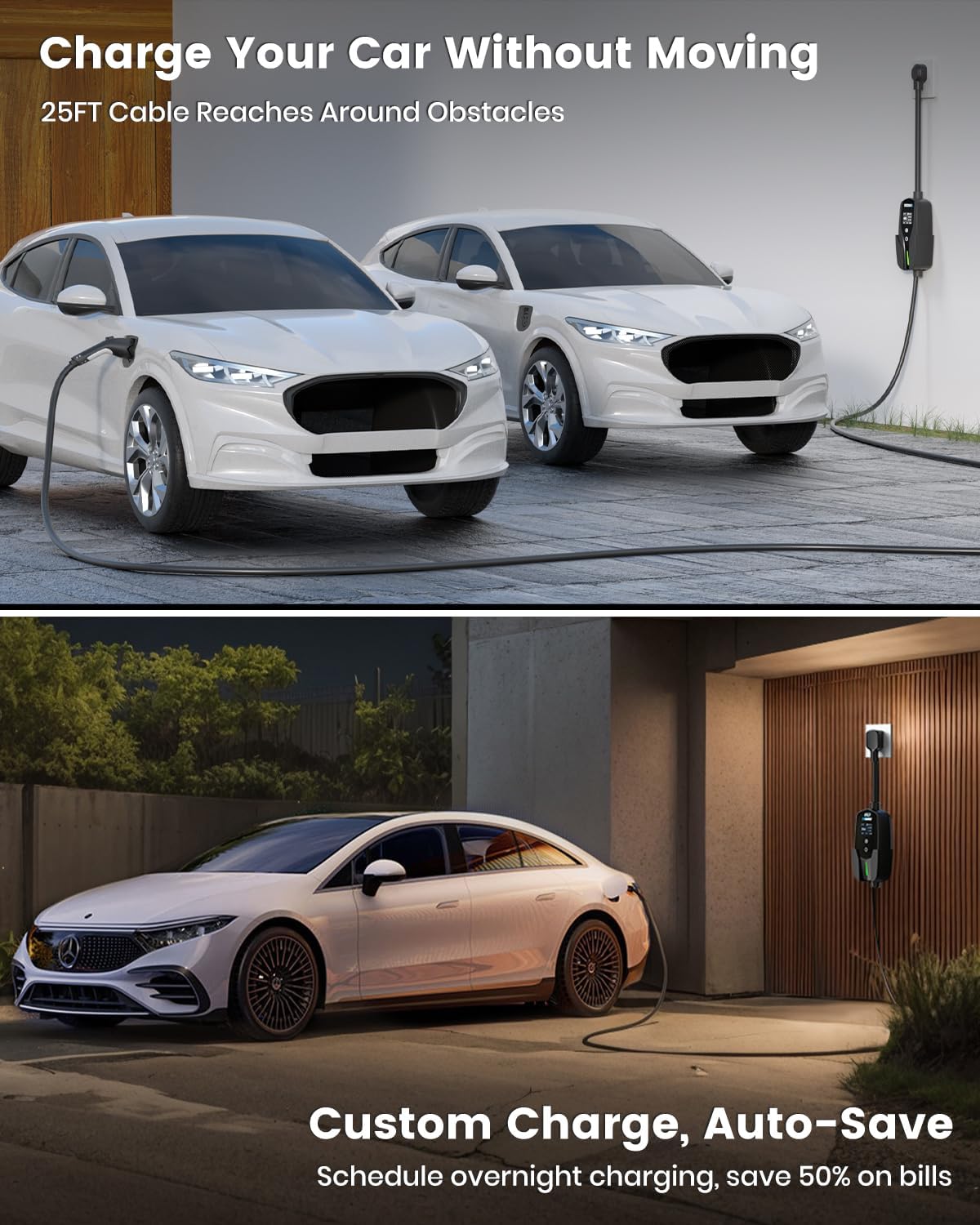 - Military-Grade Durability & Hassle-Free Warranty — The EVDANCE NEMA 14-30 EV Charger is built with certified 12AWG pure copper cables and UL 94 V-0 fireproof casing. This EV charger for home LEVEL 2 delivers safer charging — its silver-plated connectors boost conductivity while surviving 4,400-lb crush tests (think accidental car rolls). Backed by a 1-year full warranty and 24/7 U.S.-based support, charge worry-free through rain, dust, snow or daily grind.