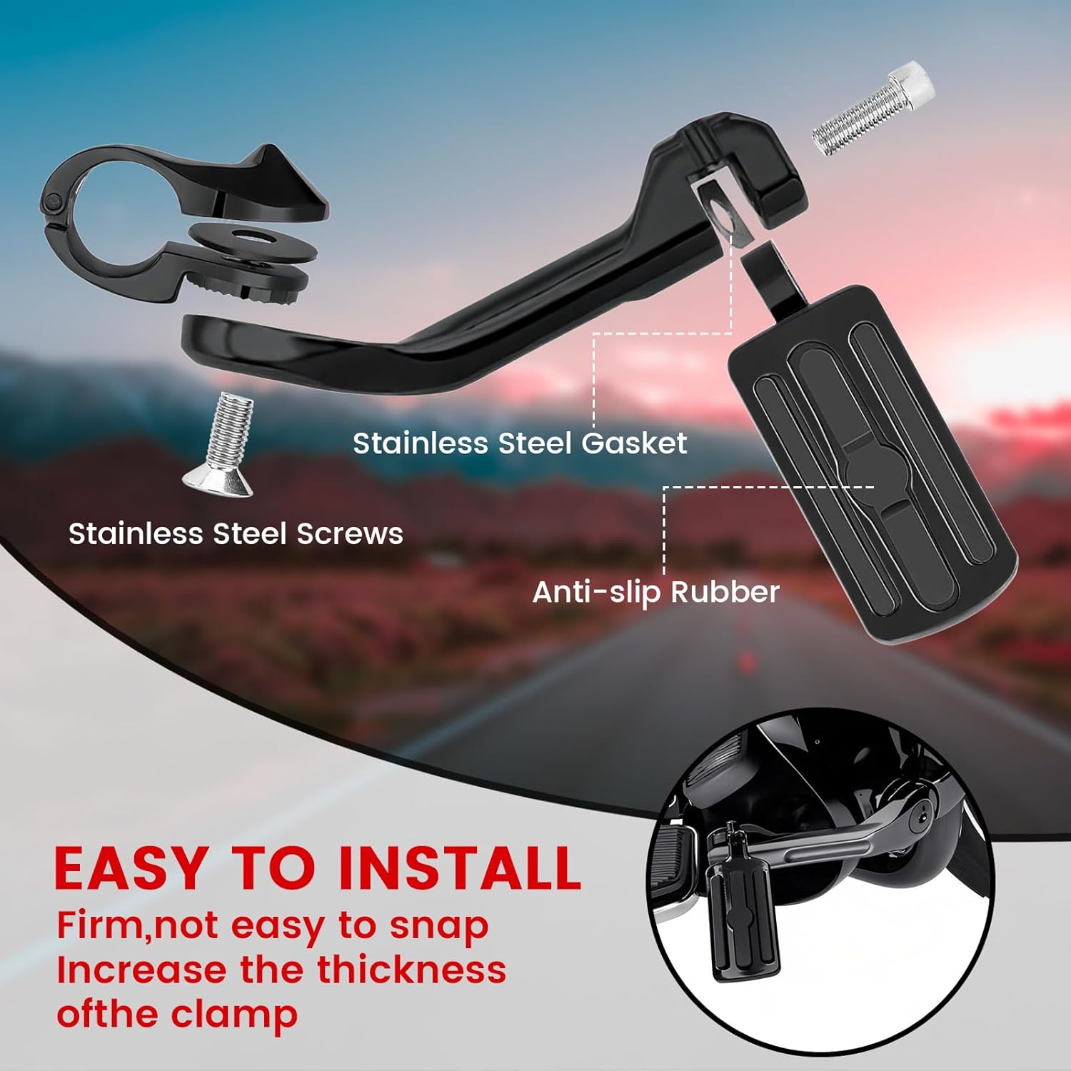 - Easy installation:The item easy to install, No drill installation and mounting clamp firmly grips the engine guard, and secures the peg at the desired angle; Please contact us by Amazon email if you have any questions