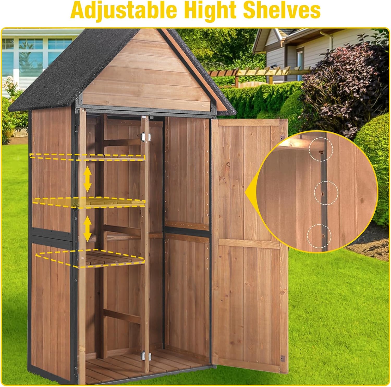 Outdoor Storage Shed,Vertical Wooden Tool Shed with Waterproof Roof,Adjustable 3 Tiers Shelves,Storage Tool Cabinet Box with Metal Frame Sloped Roof for Backyard Garden Patio Lawn (Brown)