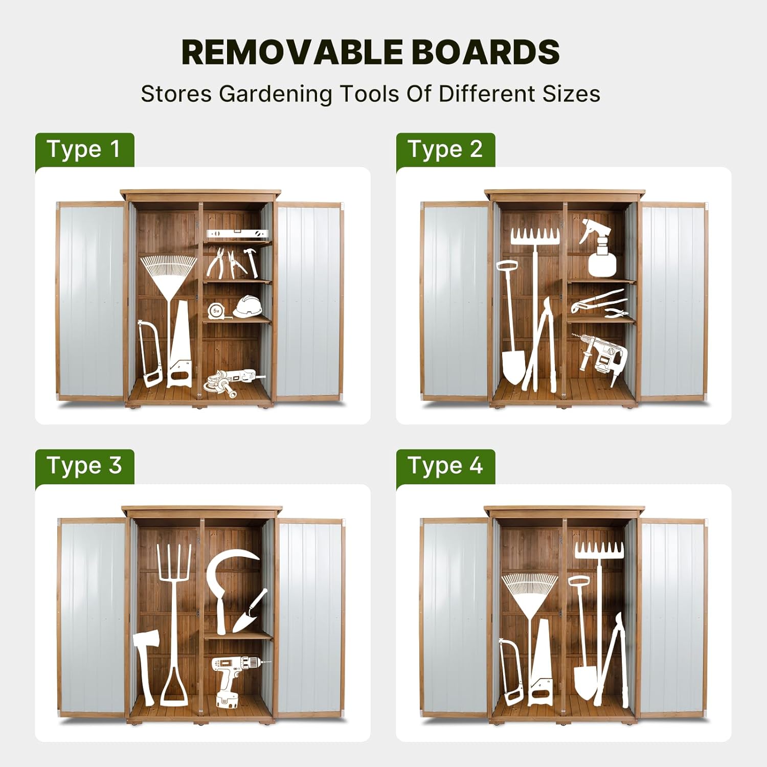 - Durable Wood & Metal Construction: Crafted from a combination of wood and metal, this outdoor storage cabinet is designed for enhanced durability. The robust construction ensures a long-lasting and weatherproof garden tool shed, capable of resisting rainwater and enduring various outdoor conditions