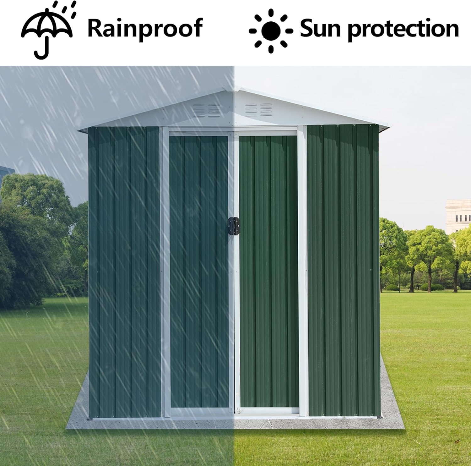 - š”šš„š„-š°šššš”šš« šššØš«šš š šš”šš: Our metal shed 6x4 features smooth, lockable sliding doors with handles for easy opening and closing. It serves not only as a safe space for storing garden tools but also as a warm pet house. The sloped roof of the storage building effectively prevents leaks and snow accumulation, while the four integrated punched vents improve airflow, helping to keep your items dry