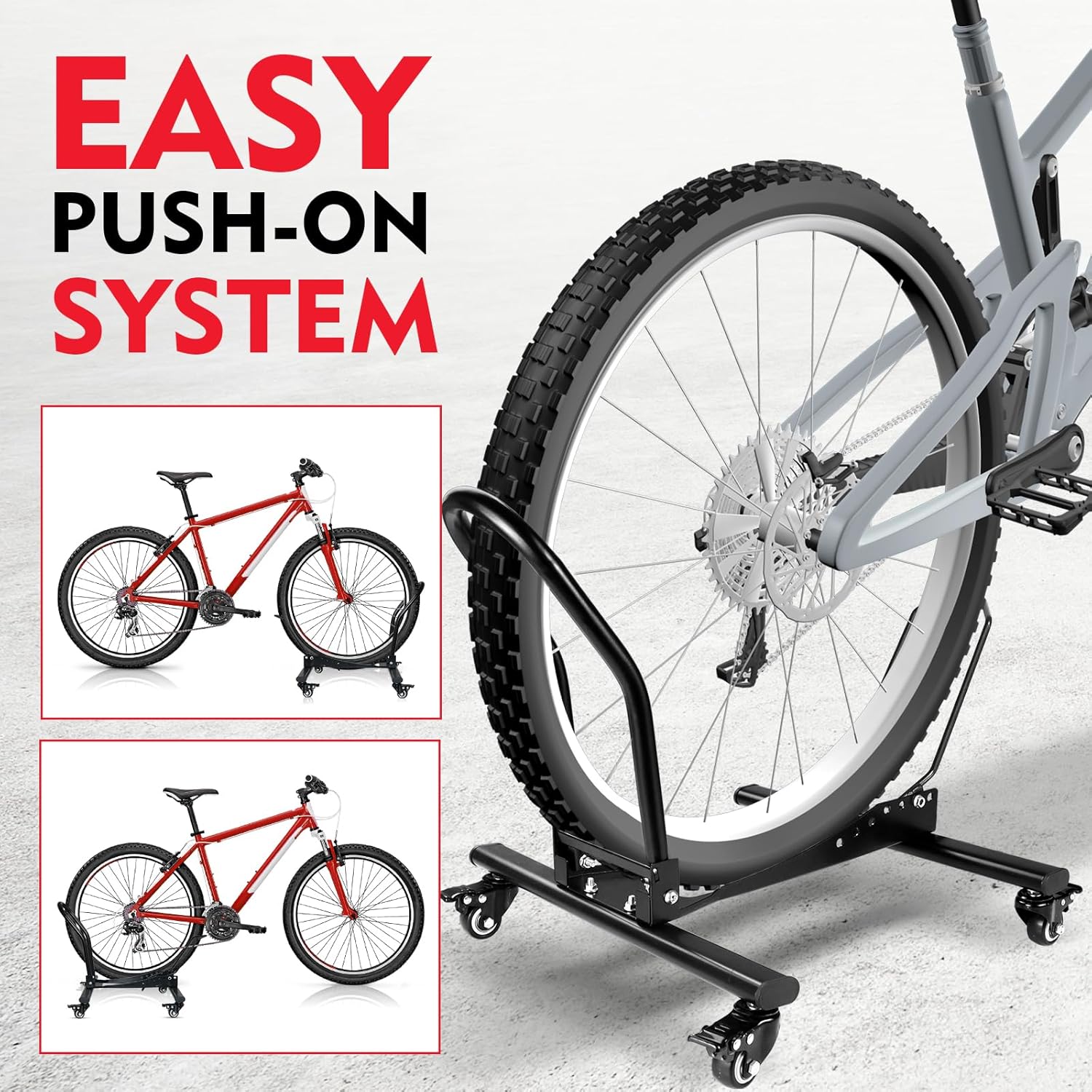 - Push-In System:No lifting,Just push the bicycle into the bike floor stand, saving energy. Make bicycle storage more convenient and efficient.High quality carbon steel material and triangular stable structure, more stable and durable than other bike stand
