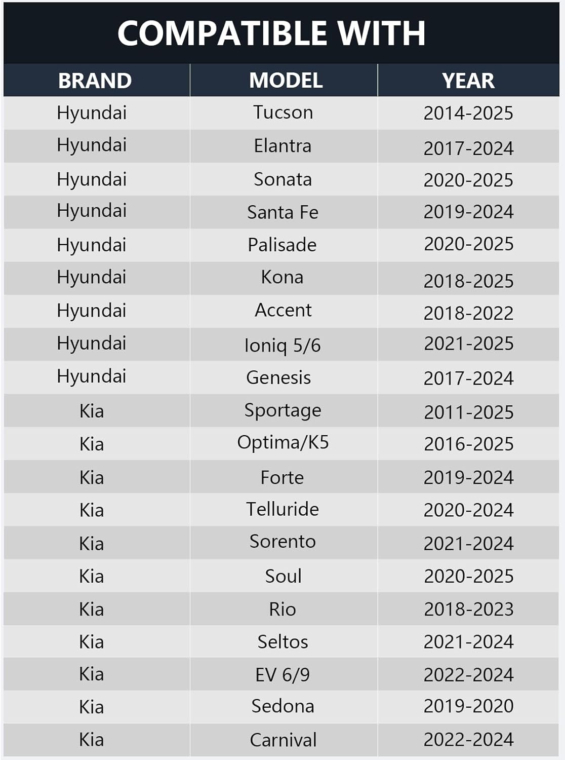 - Suitable Models: Compatible with Hyundai Tucson 2014-, Elantra 2017-, Sonata 2020-, Santa Fe 2019-, Palisade, Kona, Accent 2018-, Ioniq 5/6, Genesis 2017-; Kia Sportage 2011-, Optima/K5 2016-, Forte 2019-, Telluride, Sorento 2021-, Soul 2020-, Rio 2018-, Seltos, EV 6/9, Sedona 2019-, Carnival