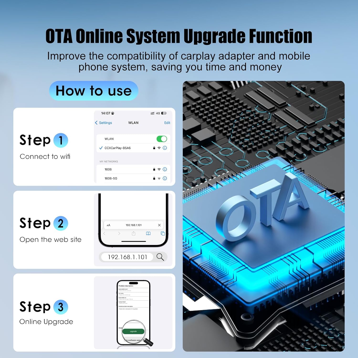 - 【Multiple Control Items】The apple car play wireless adapter retains the four original controls of the car voice assistant, steering wheel, touch screen, and central control button, making your operation safer and more convenient during driving. Also,the wireless carplay adapter supports OTA upgrades to improve the compatibility of the IOS system and wireless carplay, and can be quickly upgraded separately without additional costs