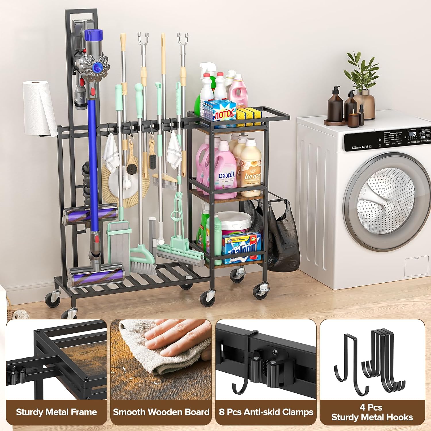 - Multifunctional Storage Design: This cleaning cart features a vacuum stand design, combining broom and mop holder with cleaning supplies organizer shelf, keeping everything neatly stored. Maximize your space and have all your cleaning tools within easy reach, making cleaning more organized and efficient.