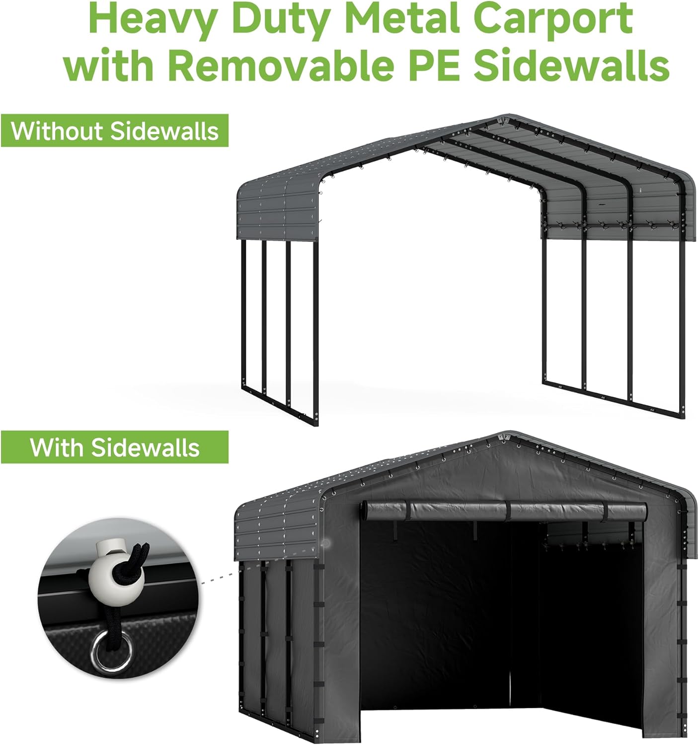 - 180g Thick PE Sidewalls: Wear and tear-resistant, with excellent waterproof and dustproof performance. Effectively protect against rain, heavy snow, and sandstorms. Designed for easy installation and removal, offering comprehensive carport protection