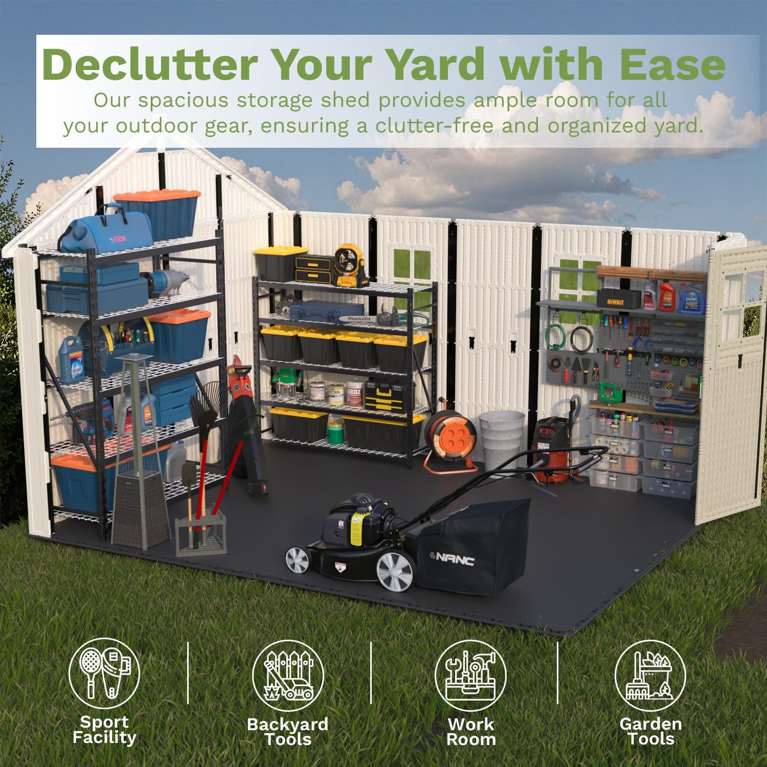 • All-Season Security: Lockable double doors and reinforced resin shield valuables from weather and intruders. Waterproof construction and UV-resistant materials defend against rain, humidity, and fading.