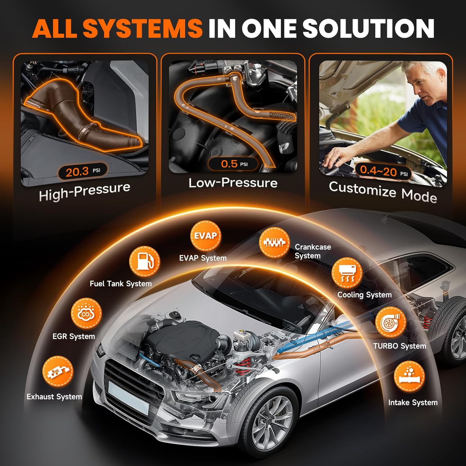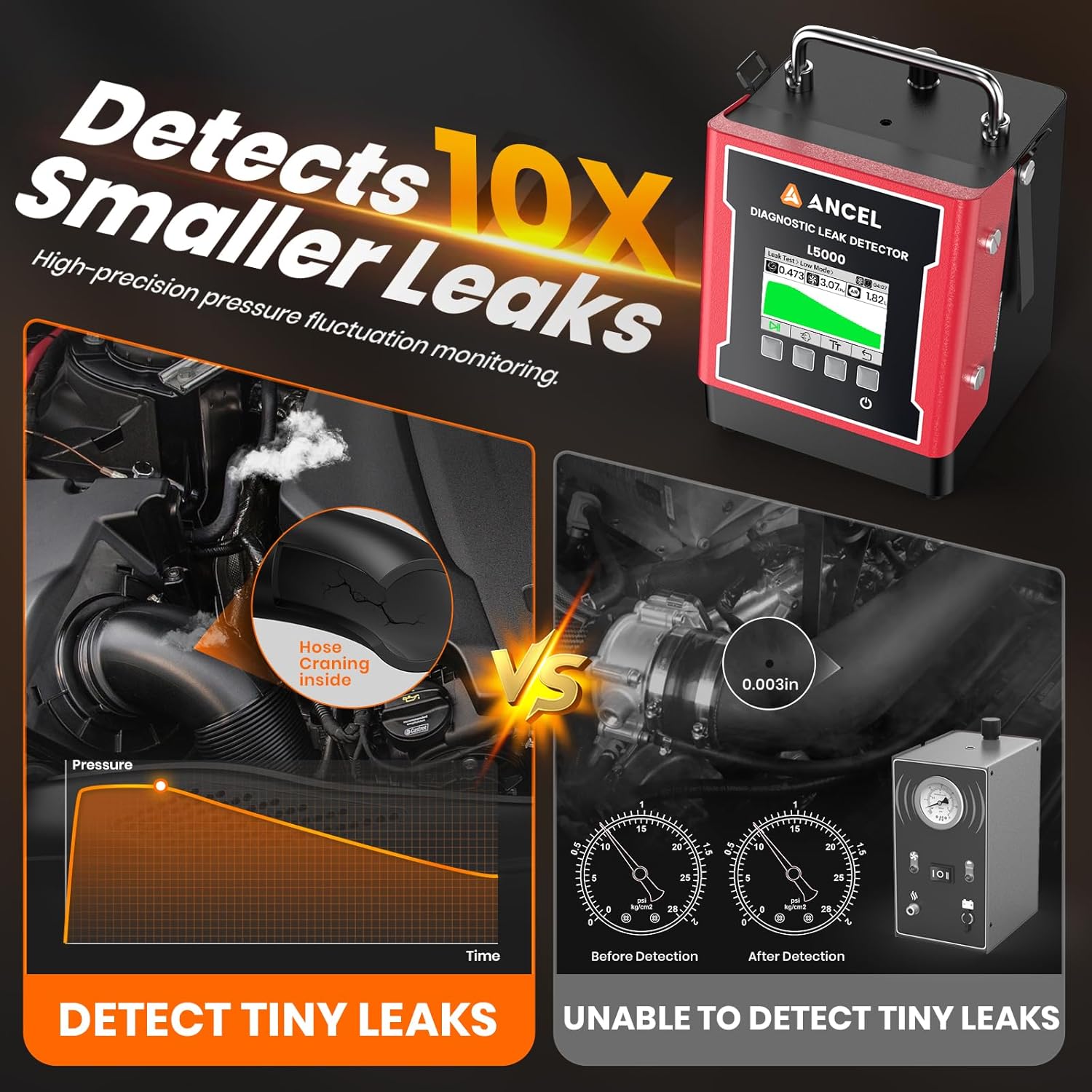 - 3 Modes, Detect Any Leak Like a Pro: Tackle any leak with ease! ANCEL L5000 smoke machine automotive offers Low (0.5 PSI), High (20.3 PSI), and Custom Pressure modes (0.4–20 PSI), perfect for diagnosing EVAP, turbo, fuel, EGR, crankcase, intake, exhaust, and cooling systems. From sunroofs and window seals to cabin leaks and tiny hose cracks, no suspicious leak goes unnoticed. Experience the confidence of accurate leak detection, so you can fix problems right the first time