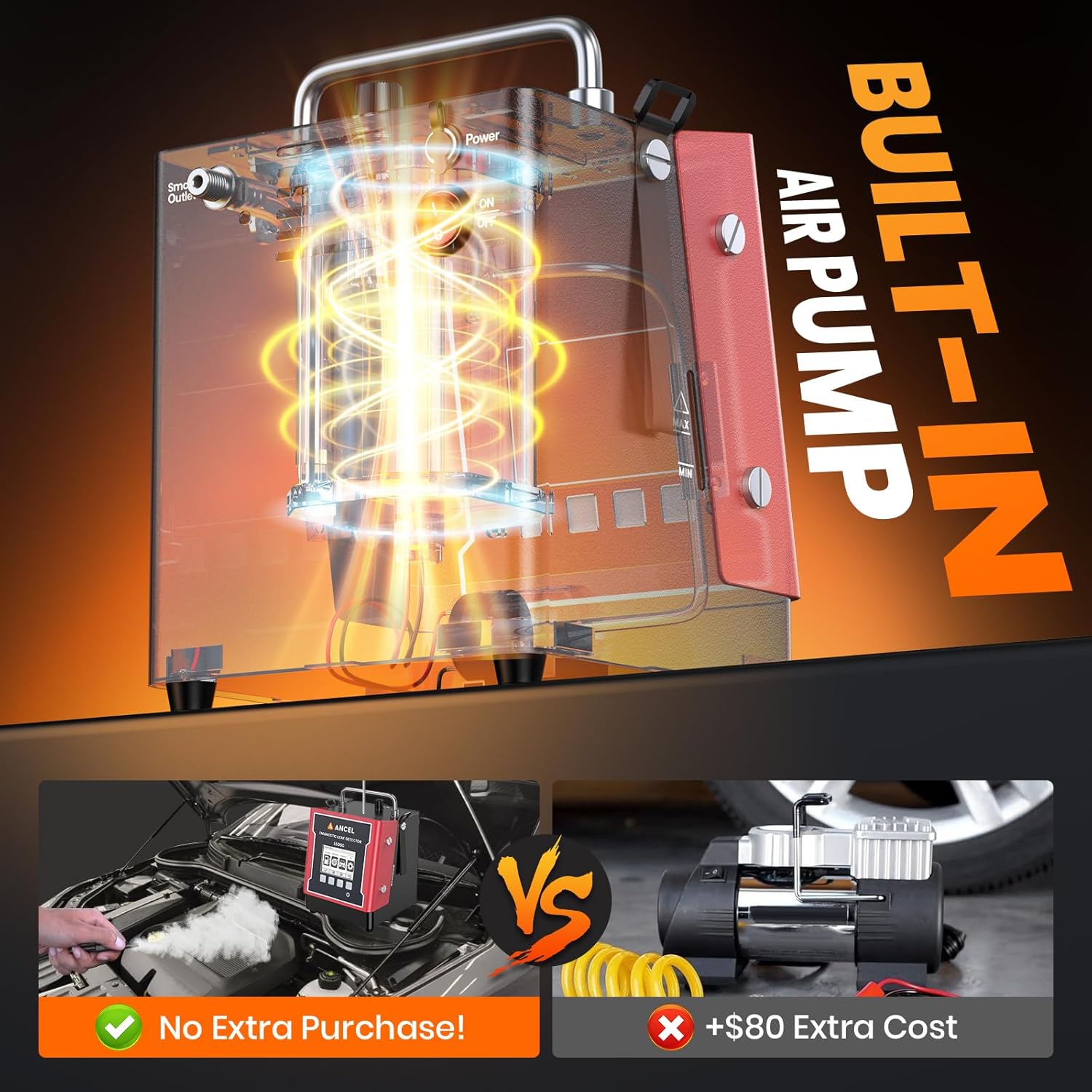 - Built-in Air Pump: No air compressor? No problem. Smoke leak detector automotive features a built-in pump that delivers adjustable 0.4 to 20.3 PSI of pressure to meet various system pressure demands, saving you extra costs and setup time. Ideal for mobile repair, roadside jobs, or tight spaces where traditional tools fall short. Efficient, portable, and always ready to work