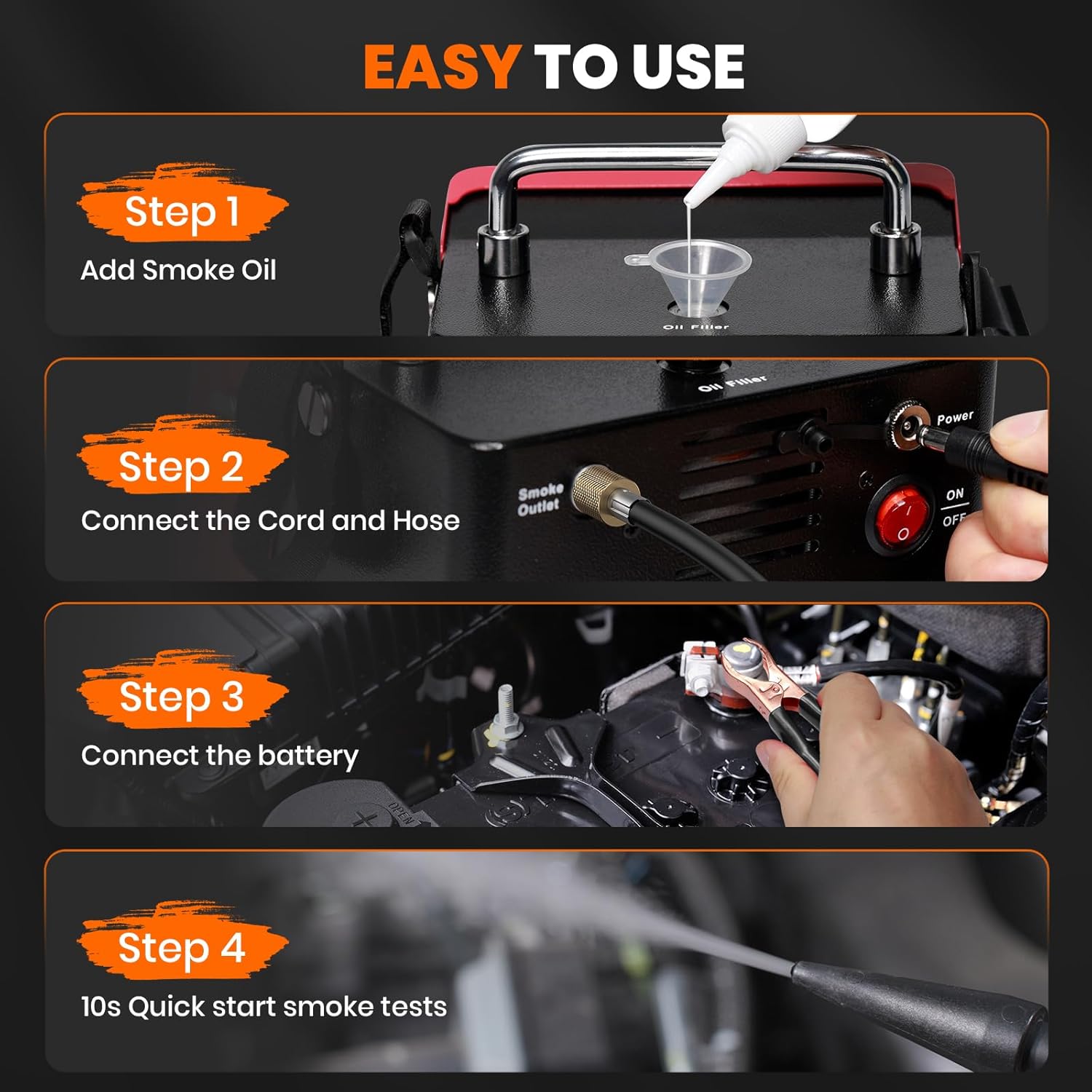 - Easy 4-Step Operation: No steep learning curve here! Start leak testing in just four steps: 1) Add smoke oil (mineral or baby oil), 2) Connect hose, 3) Attach to 12V DC, 4) Begin testing. Whether you're a first-timer or a seasoned tech, the thick smoke makes pinpointing leaks quick and easy—even in tight spots (Note: Smoke oil is not included for transport safety.)