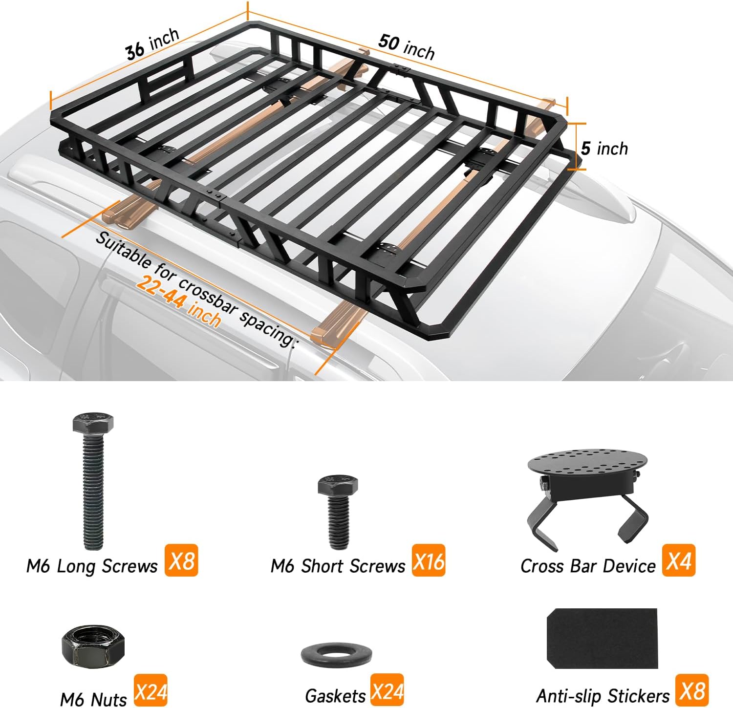 - 【Spacious Dimensions】Measuring 50" x 36" x 5", this roof rack cargo carrier provides ample space for your gear. Designed to fit vehicles with crossbar spacing between 22"-44", it’s a perfect fit for most SUVs, RVs, trucks, and pickups.