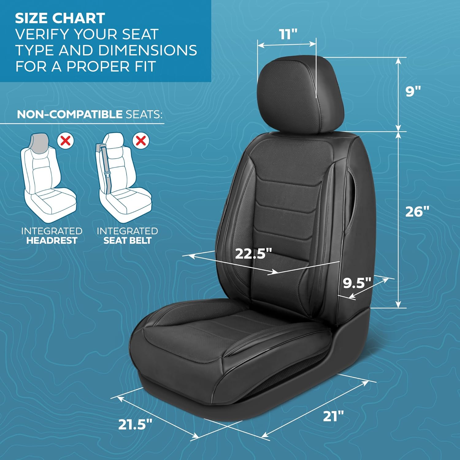 - SEMI-UNIVERAL FIT: The LUXE Edition car seat covers are designed to fit most vehicles and offer an extremely simple slip-over installation. The button-snap design for the headrest allows these car seat protectors to fit on any car seat that has an adjustable headrest however they are not compatible with vehicles that have integrated seat belts like some Ford F150's and Dodge Ram models or vehicles with integrated front seat armrests. Please review the images for fitment.