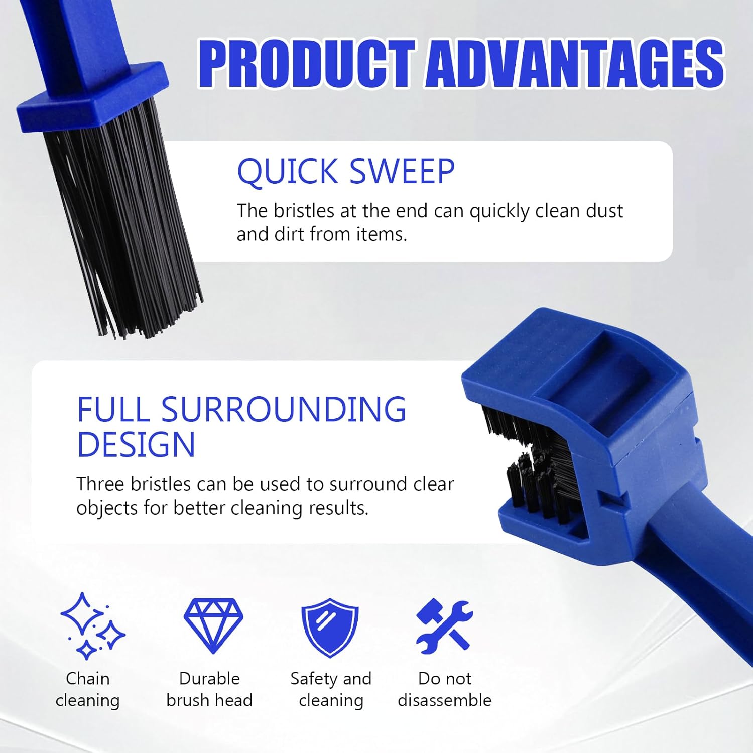 - Unique Design: This motorcycle chain brush adopts a unique three-sided bristle design to clean all four sides of motorcycle and bicycle chains. The long bristles can also clean other parts of the bicycle, such as gears, sprockets and wheels. This design makes the cleaning work more efficient and thorough. Whether you are a motorcycle enthusiast or a bicycle rider, motorcycle chain brush can provide you with a full range of cleaning solutions.