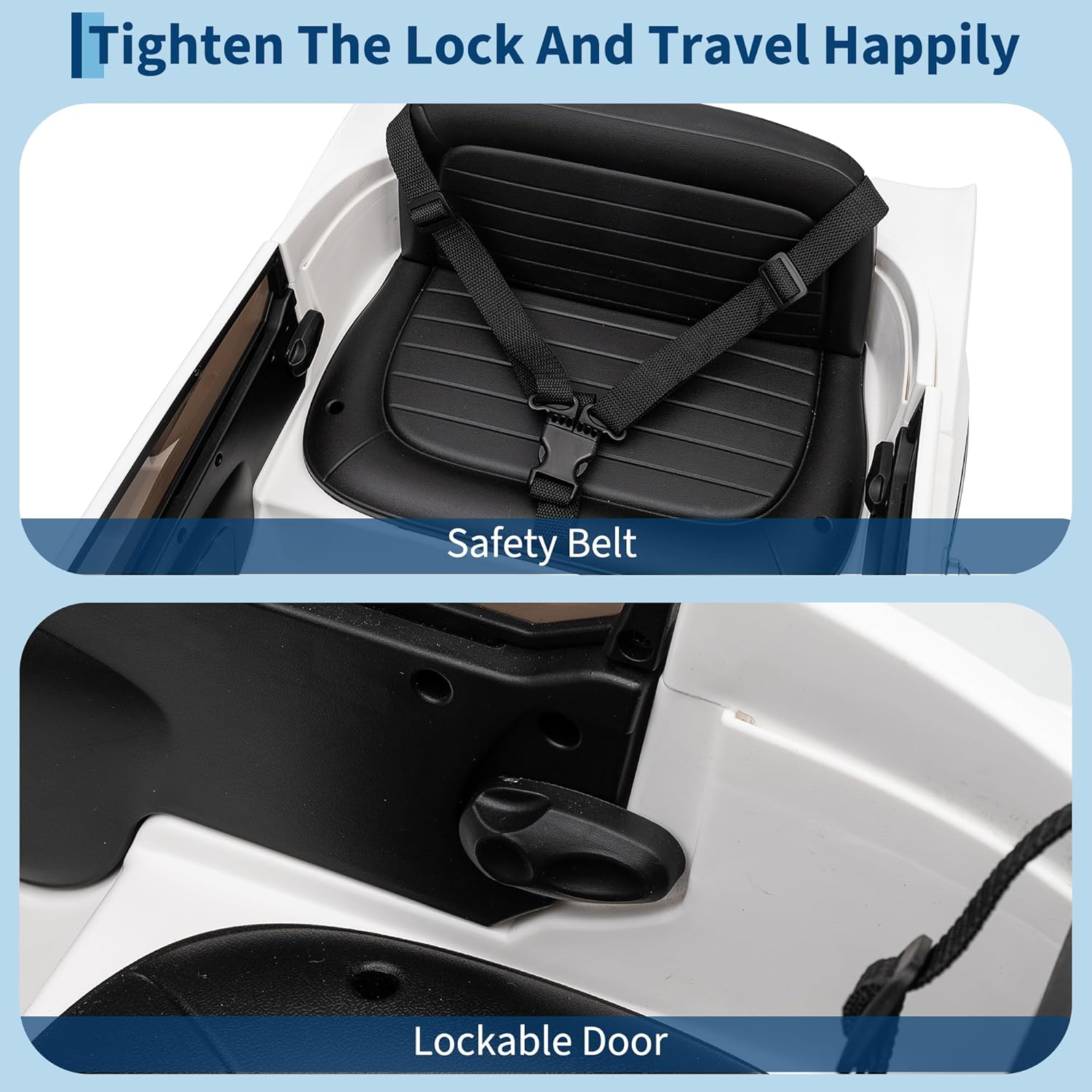 - Certified Safe Ride-On Car for Kids. This ASTM/CPSIA-certified electric vehicle delivers worry-free play with its comprehensive safety system: locking doors, 3-point safety harness, and shock-absorbing rear suspension. Designed to protect while delivering driving fun