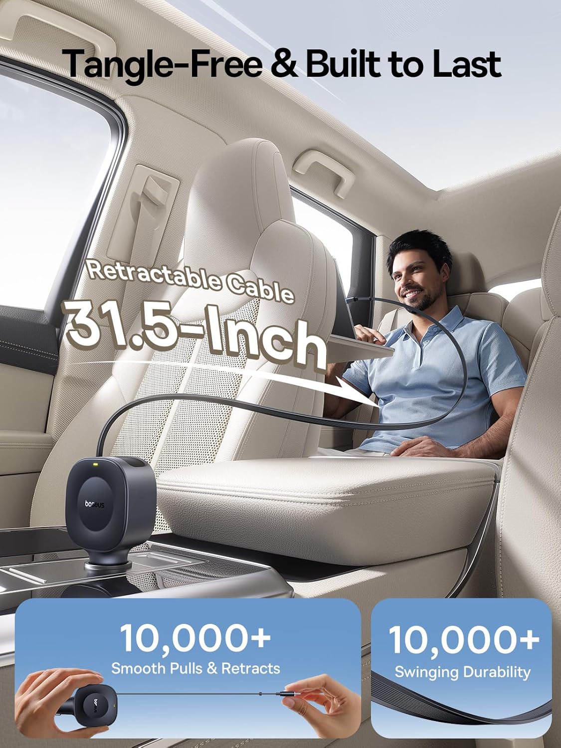 - Built-in 31.5-Inch Retractable Cable: Say goodbye to tangled cables! With a built-in 31.5-inch retractable cable, you can instantly power your device without the mess. Tested for over 10,000 smooth pulls and retractions, Baseus retractable car charger is designed for long-lasting use and effortless storage