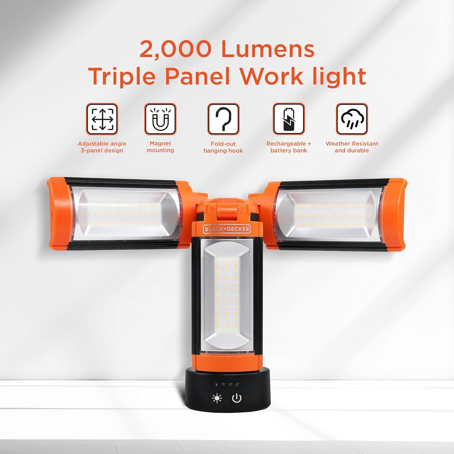 BLACK+DECKER Utility Light, Rechargeable 2000 Lumens LED 3 Panel Work Light with 6000mAh Battery Bank & Flashlight, 3 Light Colors, 4 SOS Modes, Dimmable, IP44 Water-Resistant, Magnetic & Hook Mount