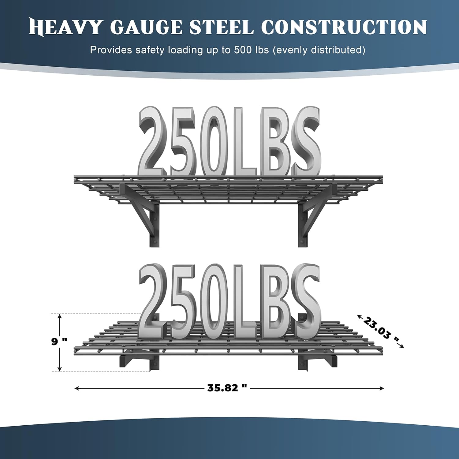 - đăHeavy-Duty Load Capacityă- Jusgym garage shelving wall mounted system is engineered with premium steel, offering exceptional strength. Each 2x3ft bracket holds up to 250 lbs, and with 2 shelves totaling 500lbs capacity, it effortlessly stores bulky items like tools, tires, and heavy storage bins. Built to last, even under extreme weight!