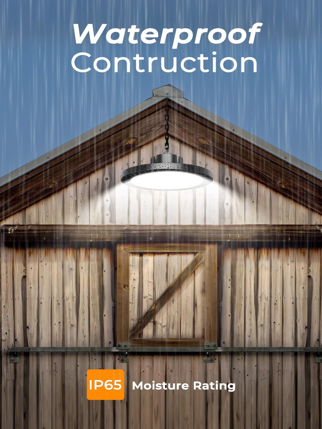 - Easy Installation with Accessories: Includes 5-inch US plug, hanging hooks, and safety rope for quick mounting of high bay led lights, simplifying setup in high-ceiling areas like factories and shops.