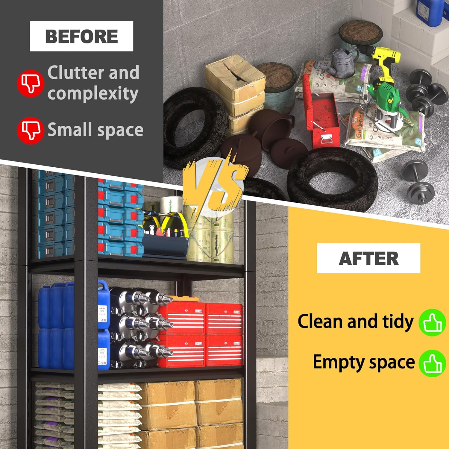 - Durable Metal Construction: Constructed from high-quality, rust-resistant metal with a powder-coated finish, this garage shelving unit is built for long-term use and maximum durability.