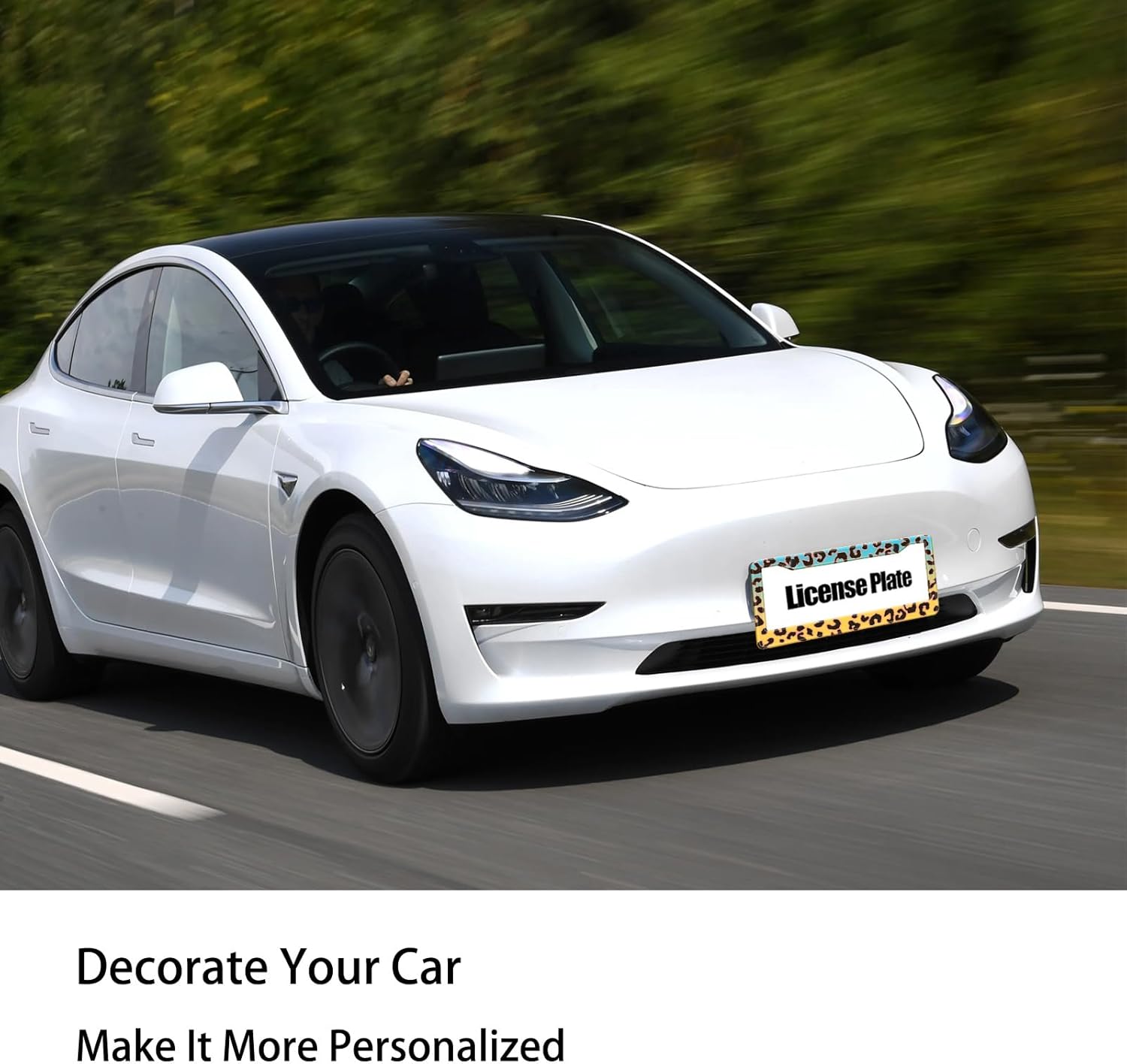 Blue Yellow Leopard License Plate Frame, Cheetah Leopar Print Car Accessories Car Tag Frame, Rust-Proof Waterproof Metal Aluminum License Plate Holder for Women Men 2 Holes with Screw Caps