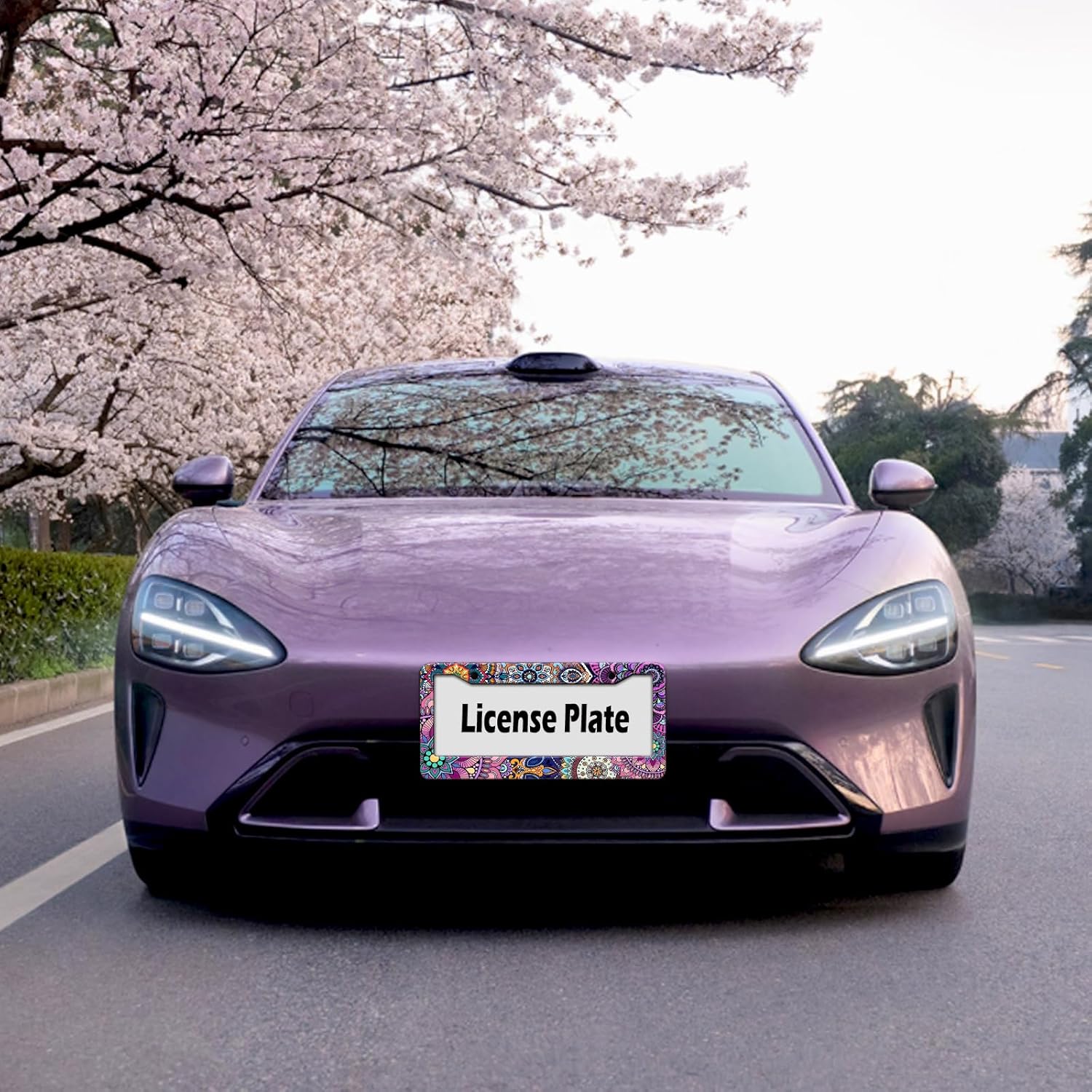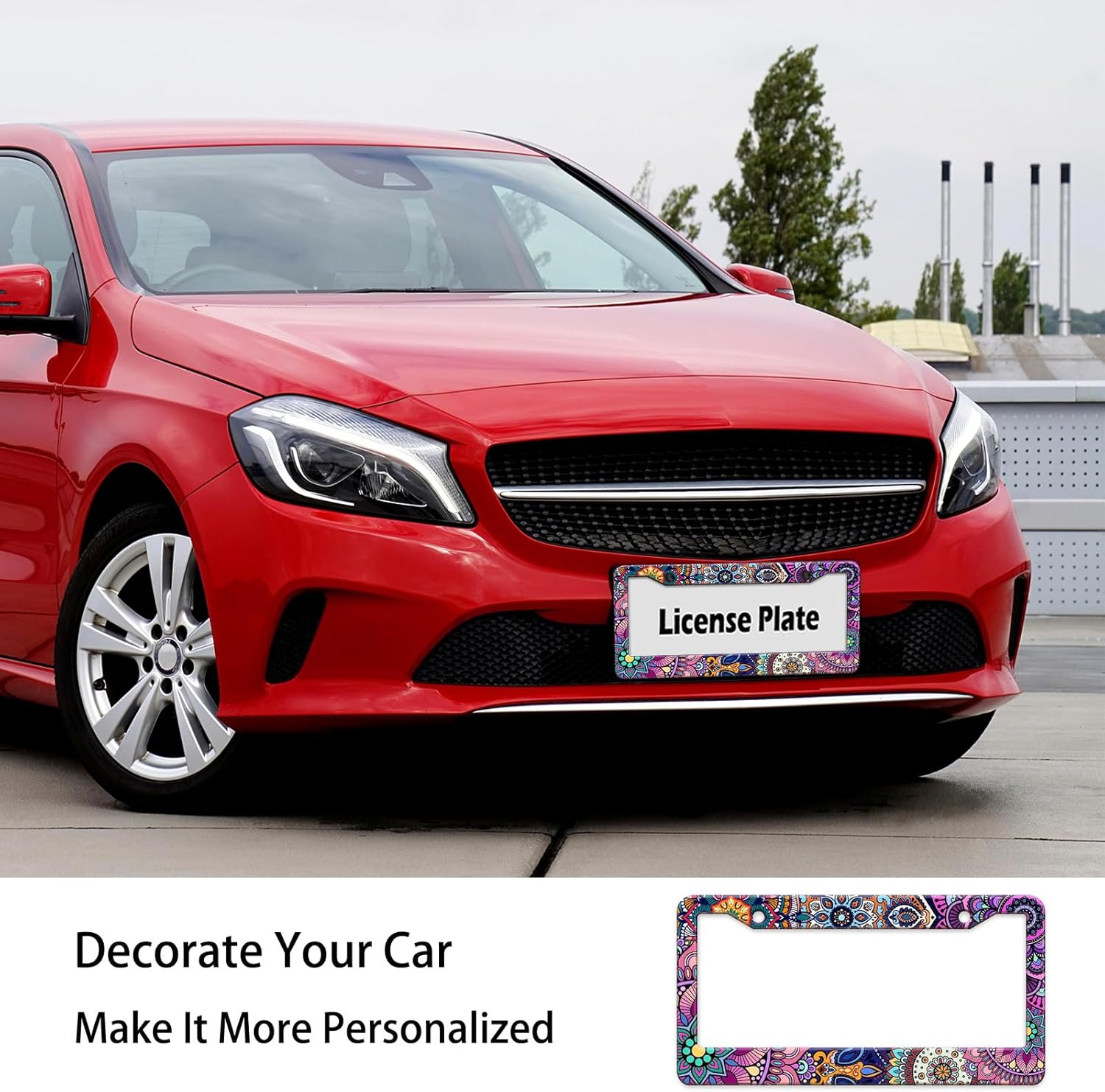 Mandala License Plate Frame, Boho Floral License Plate Holder, Flower Car Tag Holder Metal Aluminum Rustproof Car Accessories for Women Men 2 Holes with Screw Caps