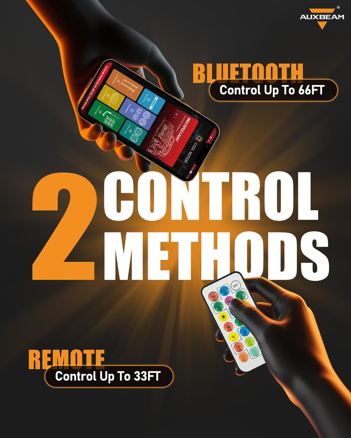 - APP & REMOTE CONTROL: Take full command via the Cool Motor Bluetooth App, or the included RF remote! Choose from 180 dynamic lighting modes, sync lights to music beats (Music Mode), or activate voice-responsive lighting (Voice Mode)—where rock lights react instantly to your voice pitch and rhythm. Use Group Management to effortlessly sync multiple AUXBEAM lights compatible with Cool Motor—all from one app
