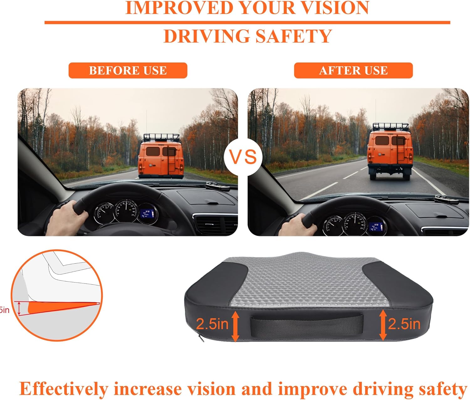 - Expand Driving Vision - The height of the driving position is increased by 2.5 inches, and apparently by using our car seat cushions for driving could expand the vision and help the driver see more clearly. The car seat cushions for short people could also promote right posture and correct spinal alignment for a good driving. We also add a non-slip bottom to keep the car seat pad in place