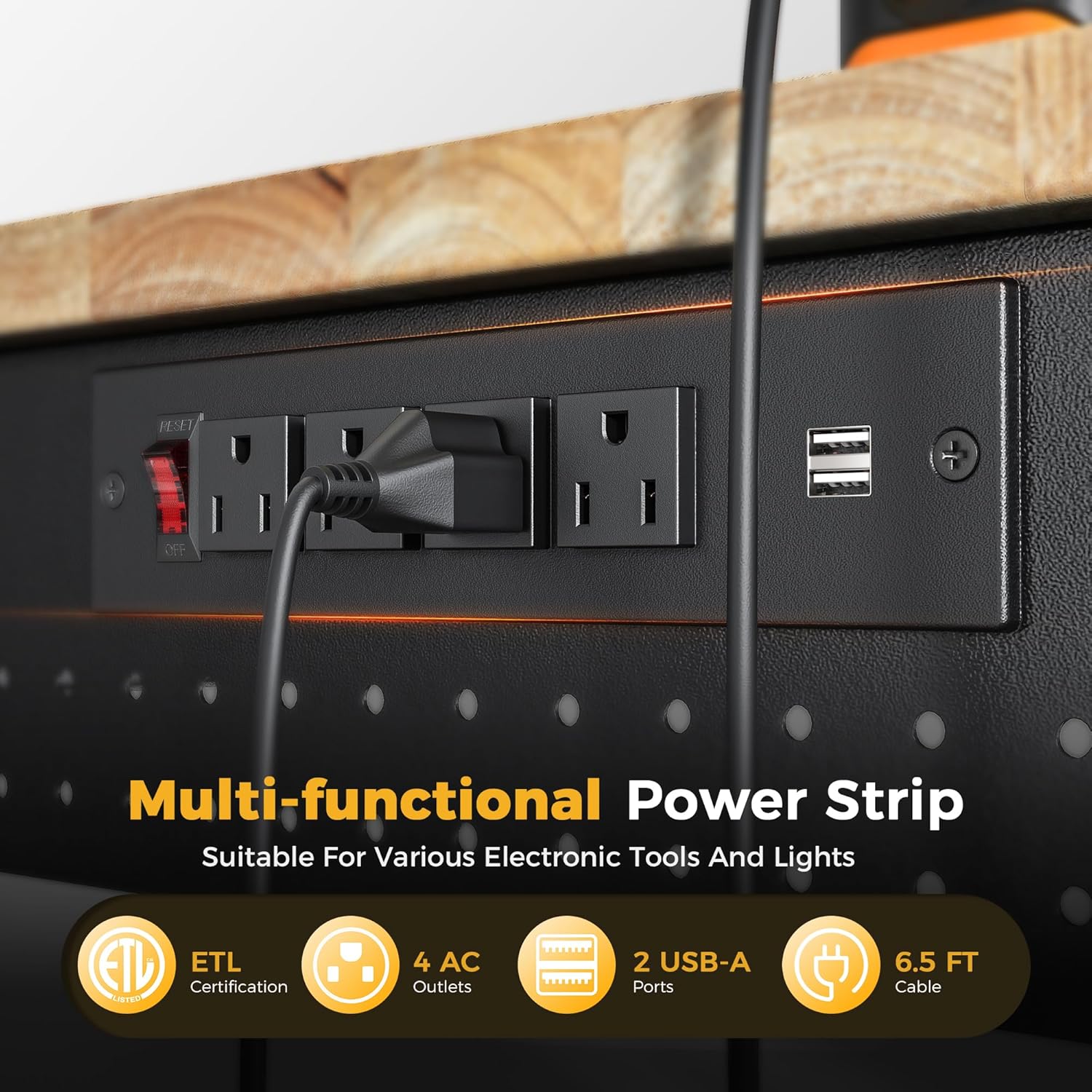 - ETL Certification Power Strip:The ETL-certified built-in power strip features 4 AC outlets, 2 USB ports, and 1 switch, along with a 6.5 ft long wire that is both safe and durable. This design makes it easy to equip the worktable with various electrical tools and lamps.