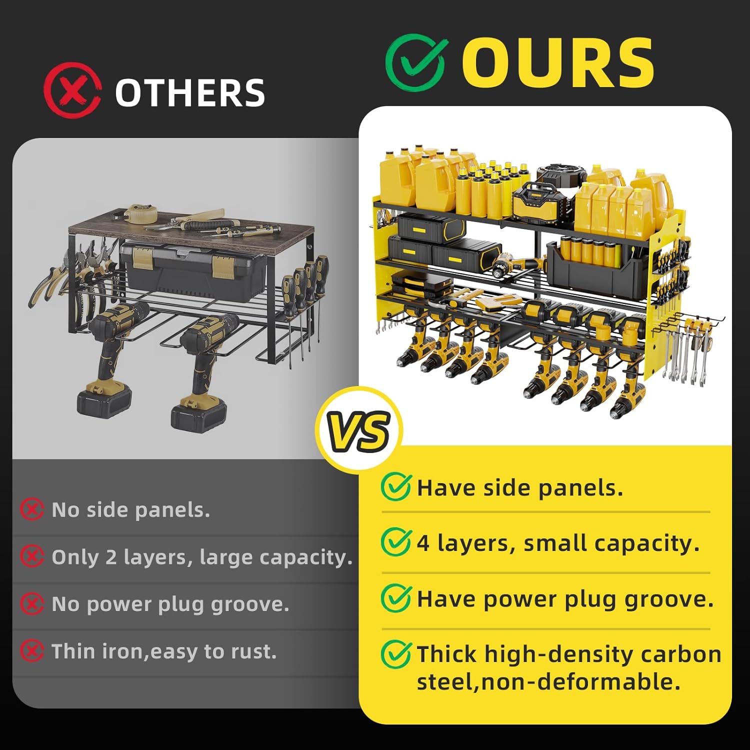 - đ§ăLARGE CAPACITY&SIDE PLATEăThis wall-mounted power tool organizer is more storage space than standard tool racks.It has 4-layer high-capacity design and 8 cordless drill holders and 2 side-plates, great for storge electric drills/power drivers/impact wrenches/mpact drills/cutters/angle grinders and other handheld power tools.The 4-layer can hold batteries, saws,wrenches,chargers and other tools, and the side racks can hold wrenches/screwdrivers/hammers/pliers, scissors, etc.