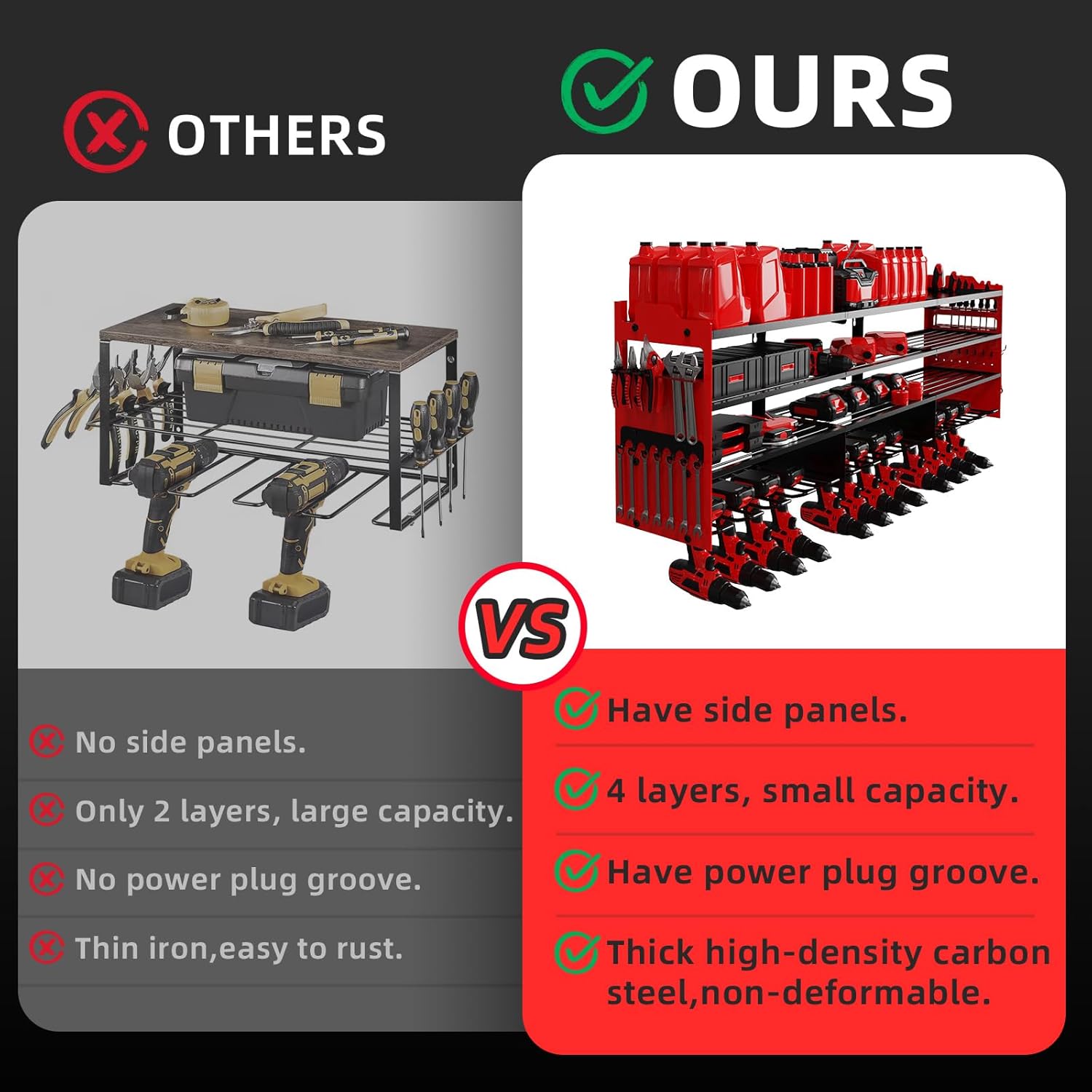 - 【LARGE CAPACITY&SIDE PLATE】This wall-mounted power tool organizer is more storage space than standard tool racks.It has 4-layer high-capacity design and 12 cordless drill holders and 2 side-plates, great for storge electric drills/power drivers/impact wrenches/mpact drills/cutters/angle grinders and other handheld power tools.The 4-layer can hold batteries, saws,wrenches,chargers and other tools, and the side racks can hold wrenches/screwdrivers/hammers/pliers, scissors, etc.