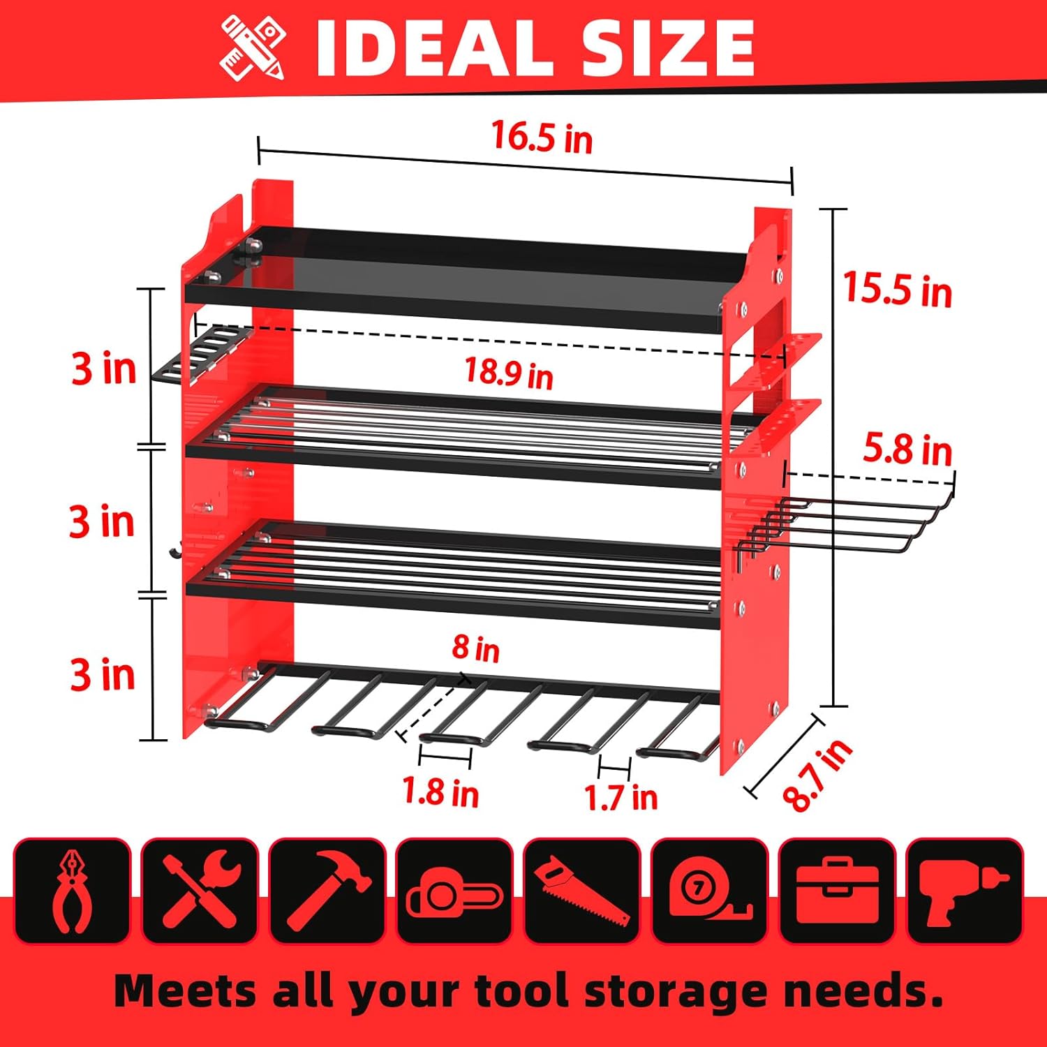 - đ§°ăEASY TO ASSEMBLEăOur cordless tool organizer is Quick 10-15 min setup (clear instructions included), a perfect power tool rack for your workshop,only need to connect the plate with screws and hang it on the wall.We provide clear installation instructions and accessorie,Installation size: 33 in (L) Ă 8.7 in (W) Ă 15.5 in (H),4 Pcs additional 5.8" detachable hooks are included.