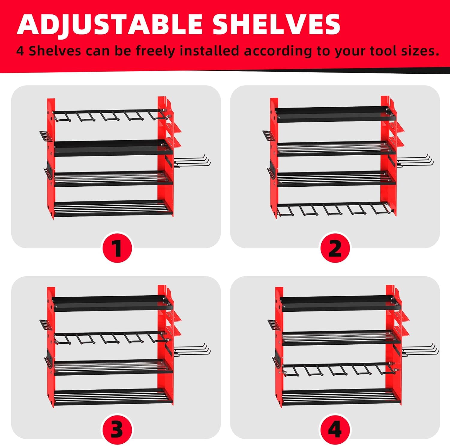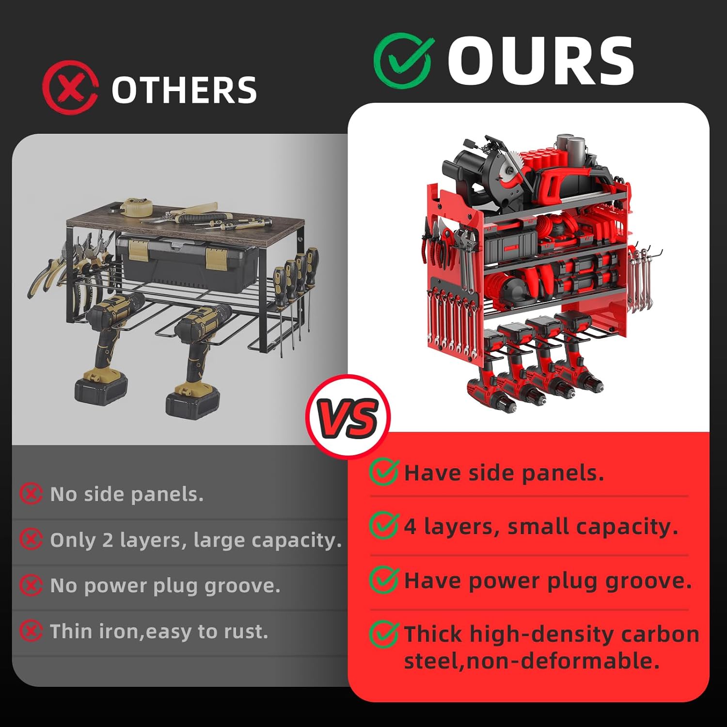 - đ§ăLARGE CAPACITY&SIDE PLATESăThis wall-mounted power tool organizer is more storage space than standard tool racks.It has 4-layer high-capacity design and 4 cordless drill holders and 2 side-plates, great for storge electric drills/power drivers/impact wrenches/mpact drills/cutters/angle grinders and other handheld power tools.The 4-layer can hold batteries, saws,wrenches,chargers and other tools, and the side racks can hold wrenches/screwdrivers/hammers/pliers,scissors,etc.