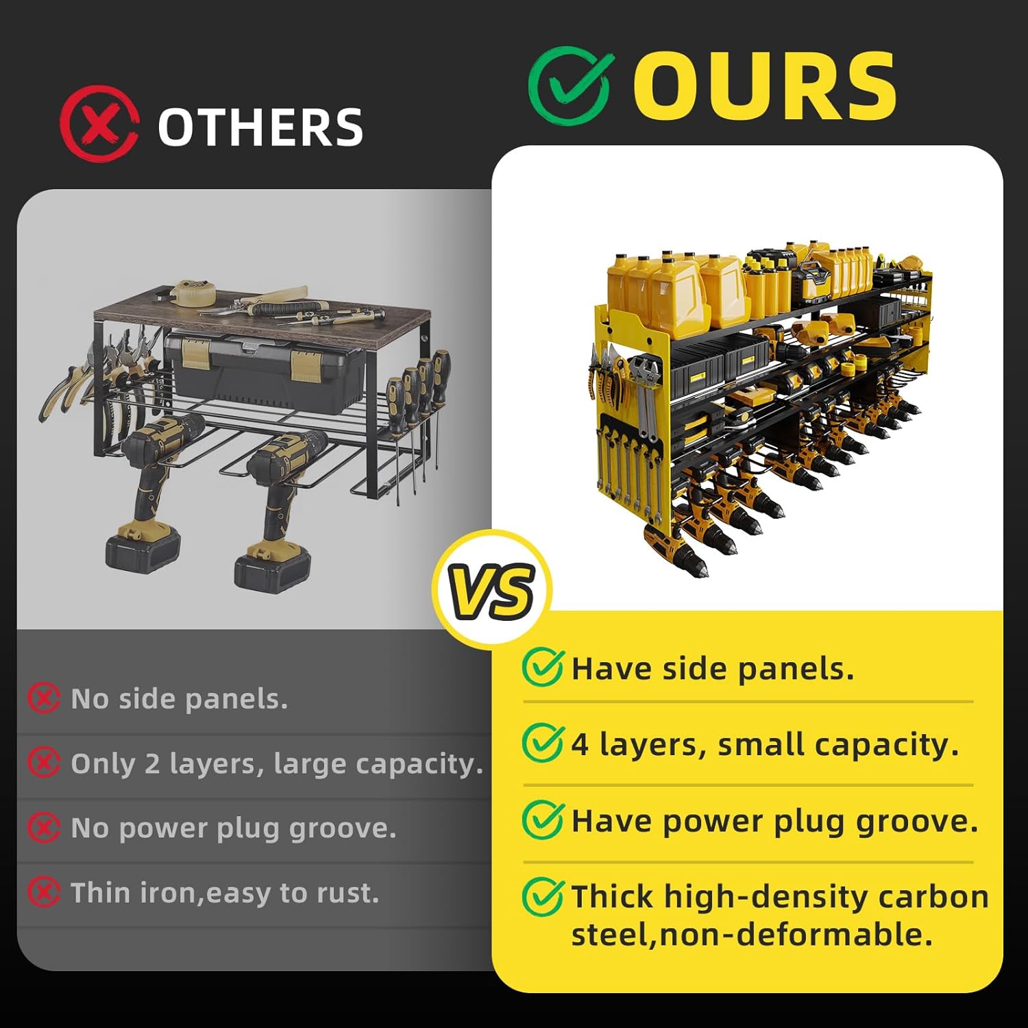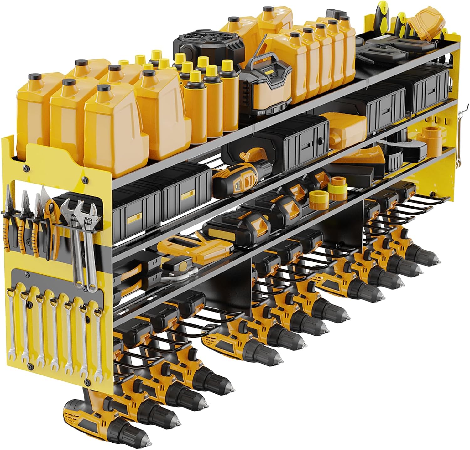 - đ§ăLARGE CAPACITY&SIDE PLATEăThis wall-mounted power tool organizer is more storage space than standard tool racks.It has 4-layer high-capacity design and 12 cordless drill holders and 2 side-plates, great for storge electric drills/power drivers/impact wrenches/mpact drills/cutters/angle grinders and other handheld power tools.The 4-layer can hold batteries, saws,wrenches,chargers and other tools, and the side racks can hold wrenches/screwdrivers/hammers/pliers, scissors, etc.