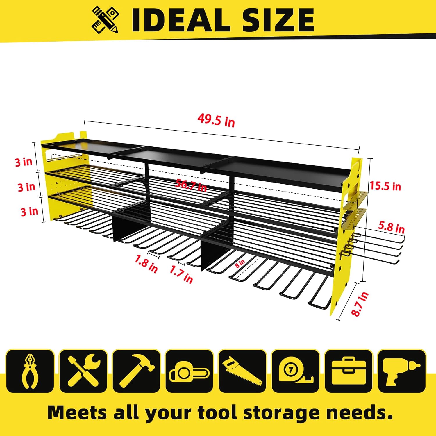 - đ§°ăEASY TO ASSEMBLEăOur cordless tool organizer is Quick 10-15 min setup (clear instructions included), a perfect power tool rack for your workshop,only need to connect the plate with screws and hang it on the wall.We provide clear installation instructions and accessorie,Installation size: 49.5 in (L) Ă 8.7 in (W) Ă 15.5 in (H),4 Pcs additional 5.8" detachable hooks are included.