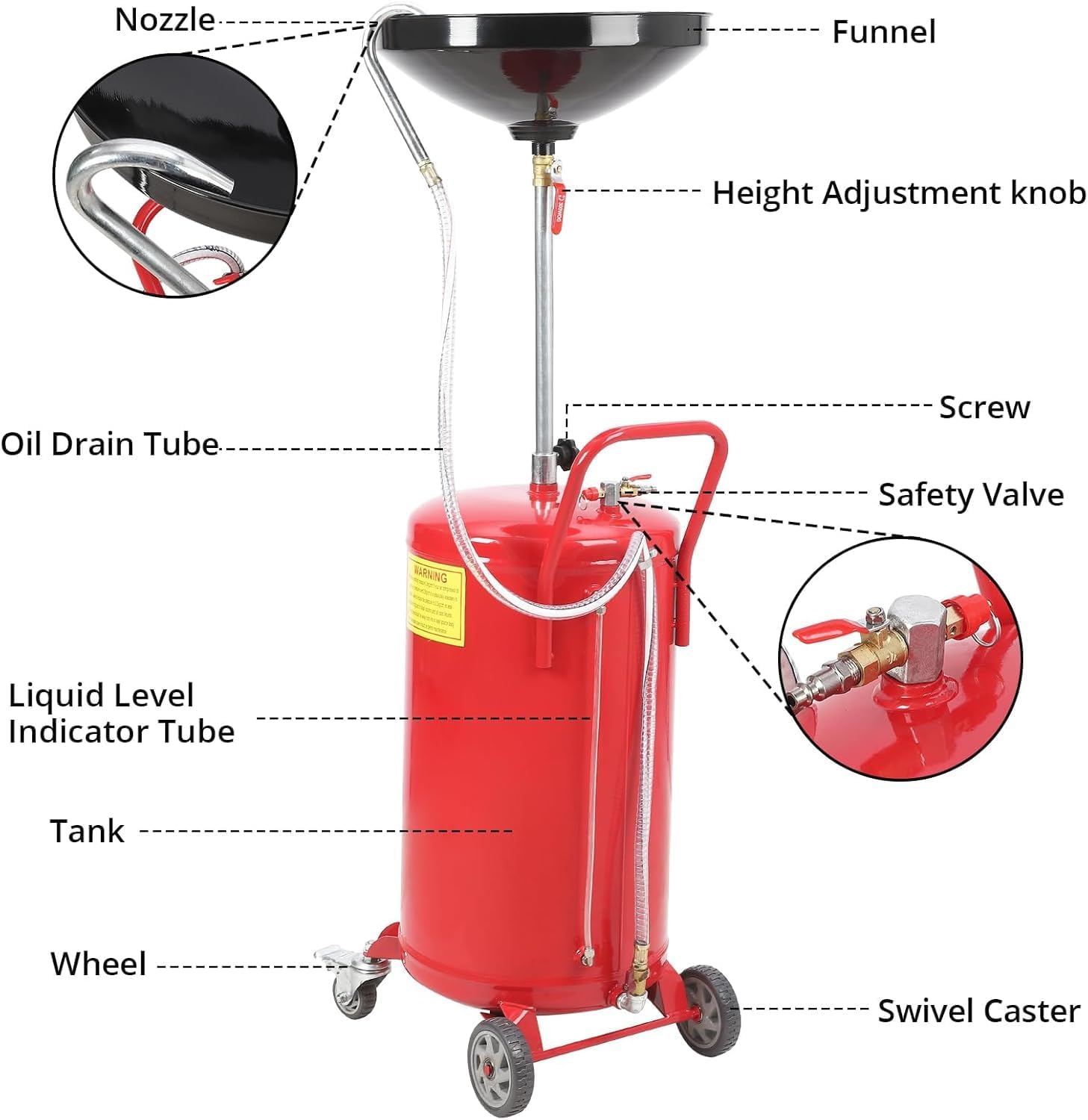 - Adjustable Funnel Height: Equipped with an adjustable funnel that can be set to various heights for convenient and precise oil drainage, minimizing spills and messes.