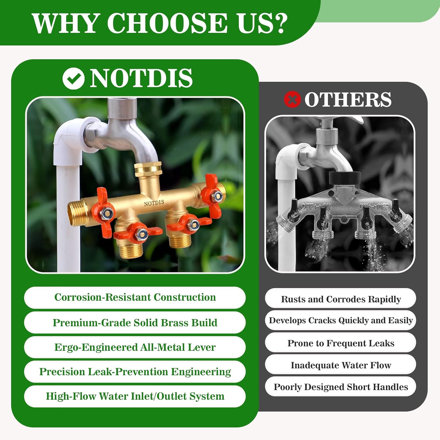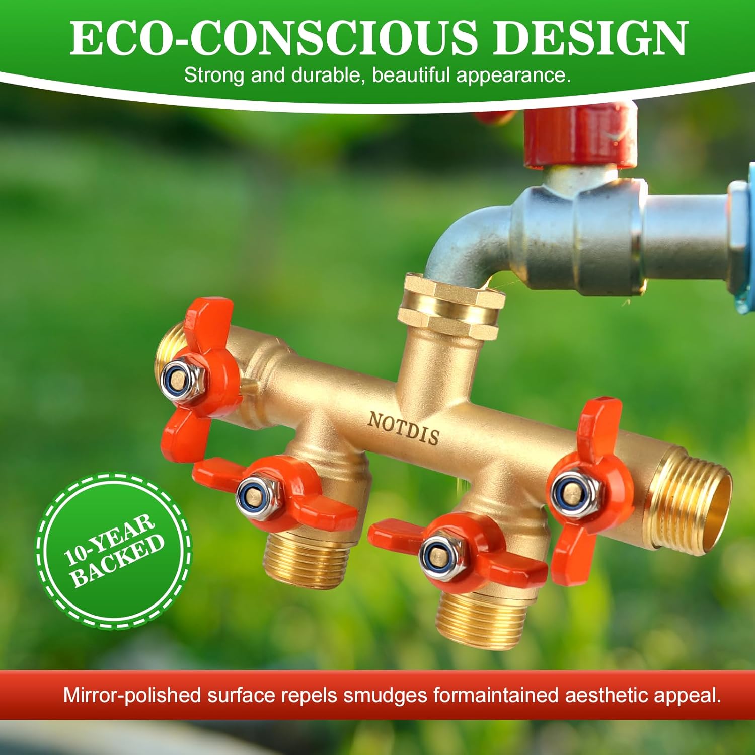 4 Way Brass Hose Splitter Full Flow with Metal Handle - Heavy Duty Spigot Splitter with Shut Off Valve, 3/4"" GHT Garden Tap Connector